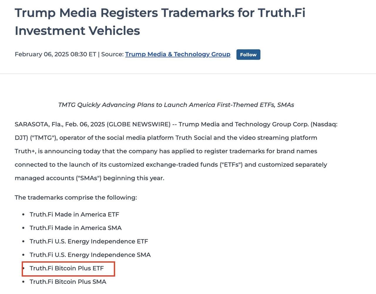 Today, we were provided even more clarity as Trump Media & Technology Group (TMTG) registered trademarks for Truth.Fi investment vehicles. We can see in this registration the plan to launch a Bitcoin Plus ETF. I assume the “Plus” portion means that this ETF will not be singularly focused on Bitcoin but may include other crypto assets such as Ethereum.