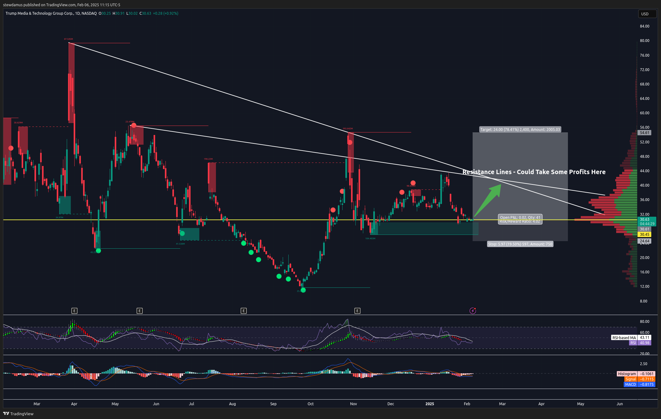 I already had the DJT stock focused in my TradingView list for a potential entry, but the recent news above makes it even more enticing for entry here. So now, let’s take a closer look at my chart and some potential trade strategies on the DJT stock.