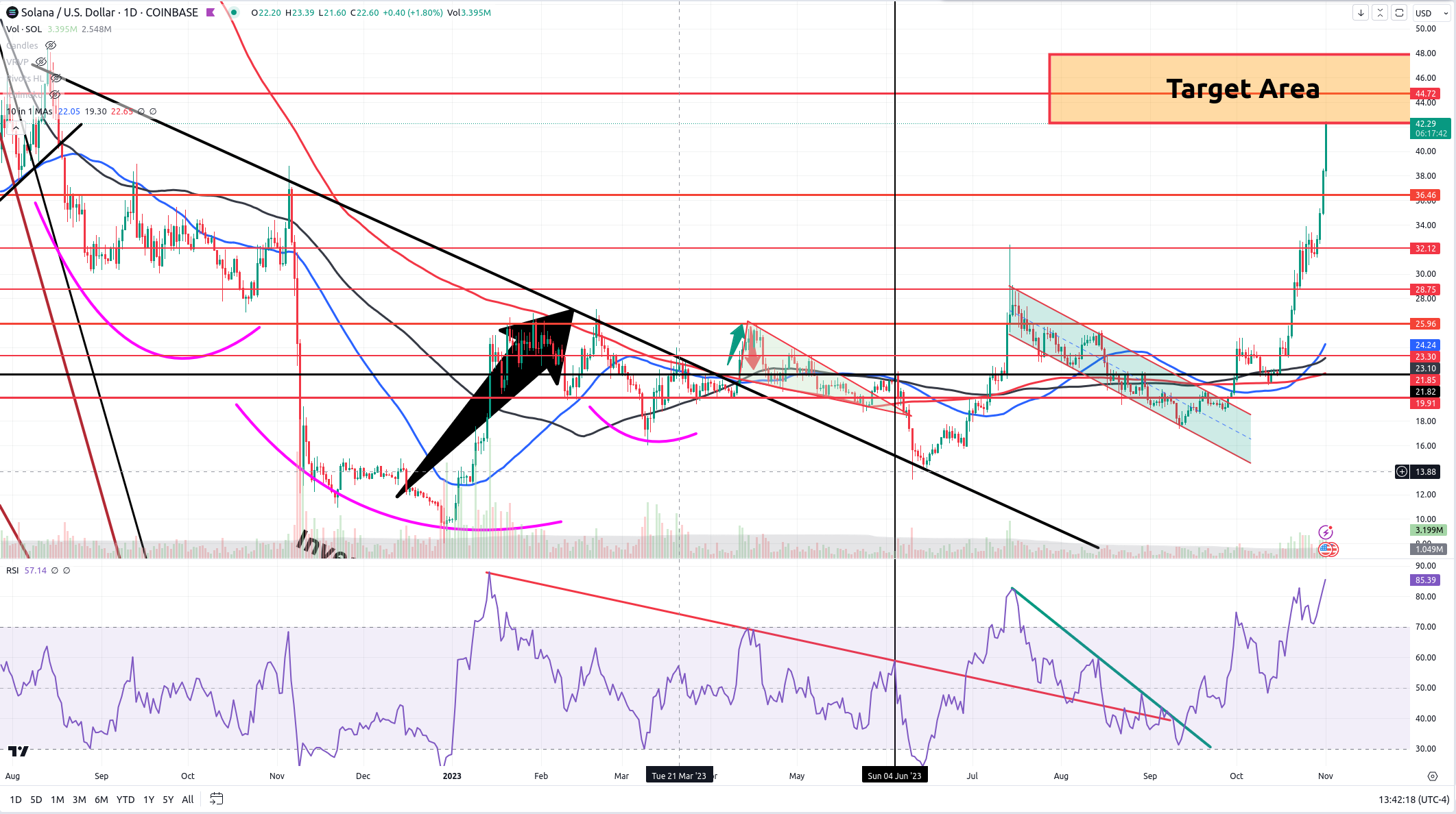 Solana has reached it's target from a long-standing inverse H&S pattern. Daily RSI is over 86 as of this post. Going short here. SL 48. Target 32.