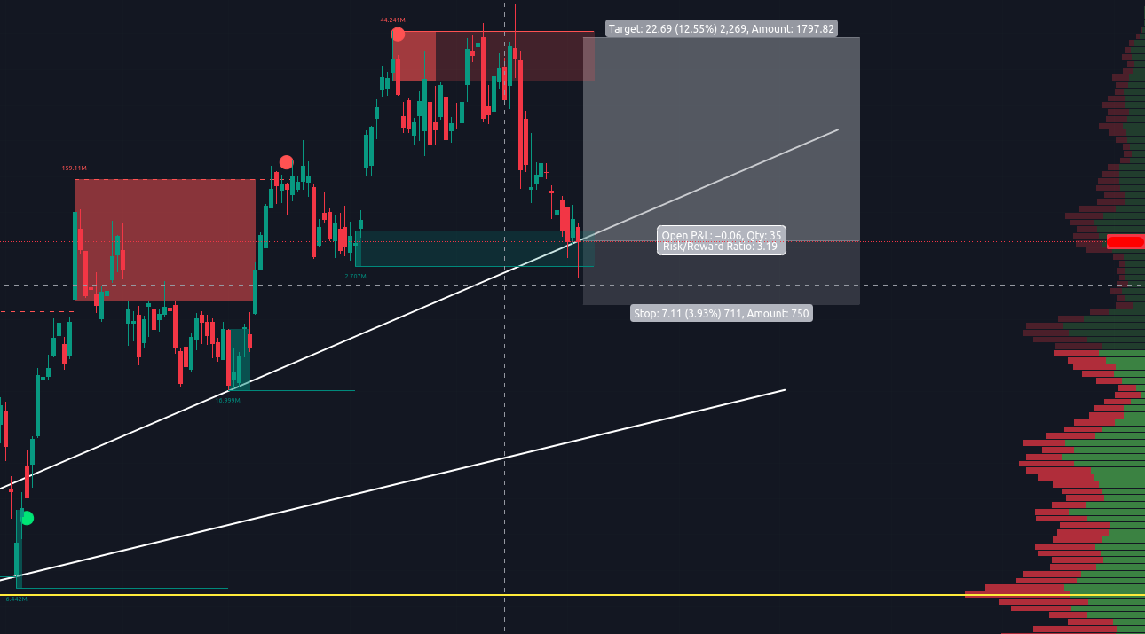 Though, it’s been repainted since the screen capture, I got a green dot from my proprietary indicator on this hot tech stock. We’ve got a beautiful setup here right above a support trendline and inside that liquidity block. RSI is a low 37 and the MACD is starting to turn up (see chart below for that). Also, look at that nice hammer candle. Our rrr is 3:1 for a decent 12% profit potential to our final target. The stock is