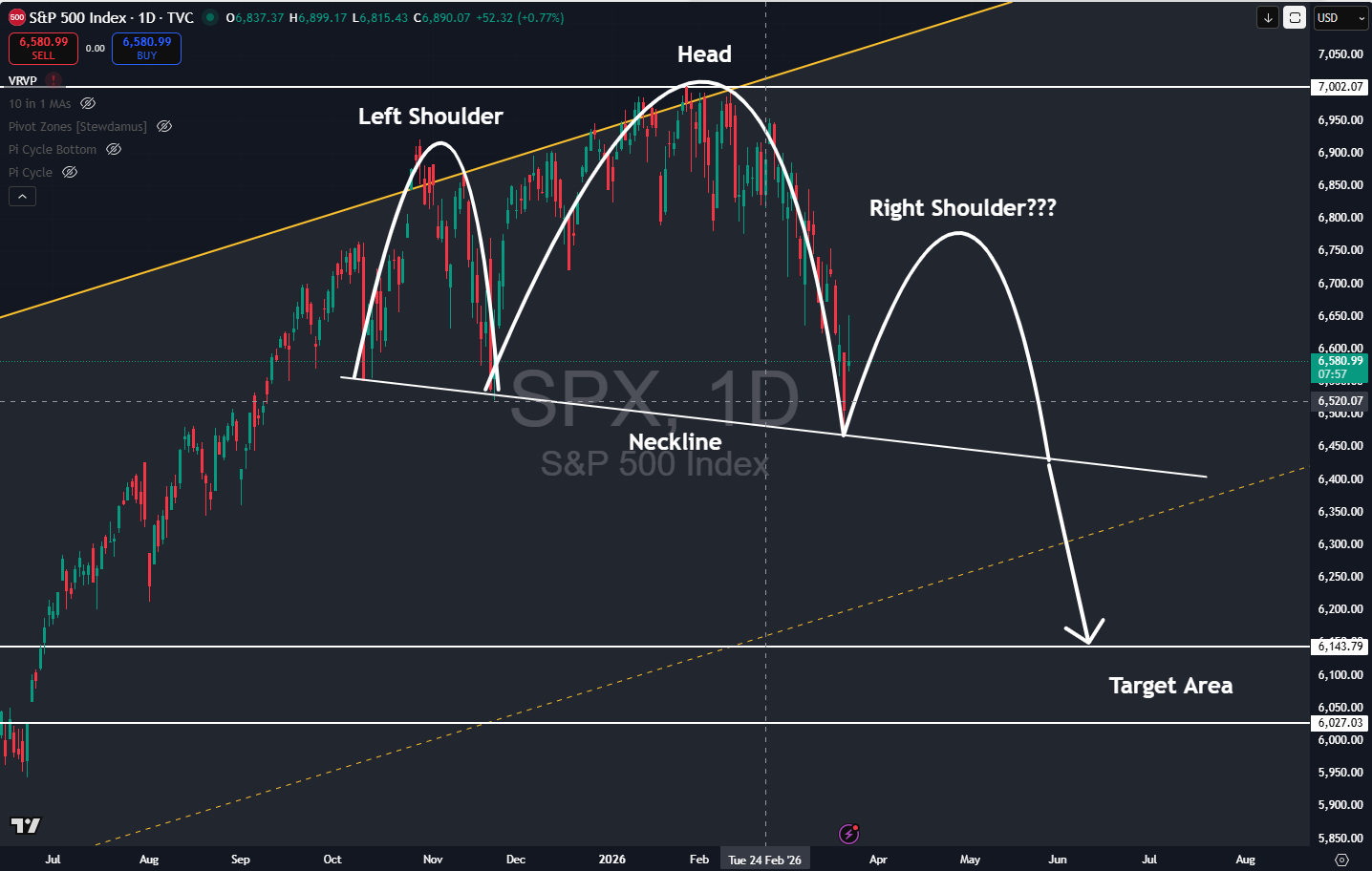 As we trade through this treacherous market, I check the big charts daily to understand if they are telling me anything new via volume, pattern, trends, etc. Today I’ve spotted what appears to be a rather ominous Head and Shoulders pattern forming on the SPY/SPX charts. If correct, we should see a continued rebound in stocks for at least this week and into next, until the top of that right shoulder is found. For this pattern to be confirmed, we would then need to see the price start to fall again down to that neckline. If that neckline were to break, I would expect further selling down to around $6000-6100.