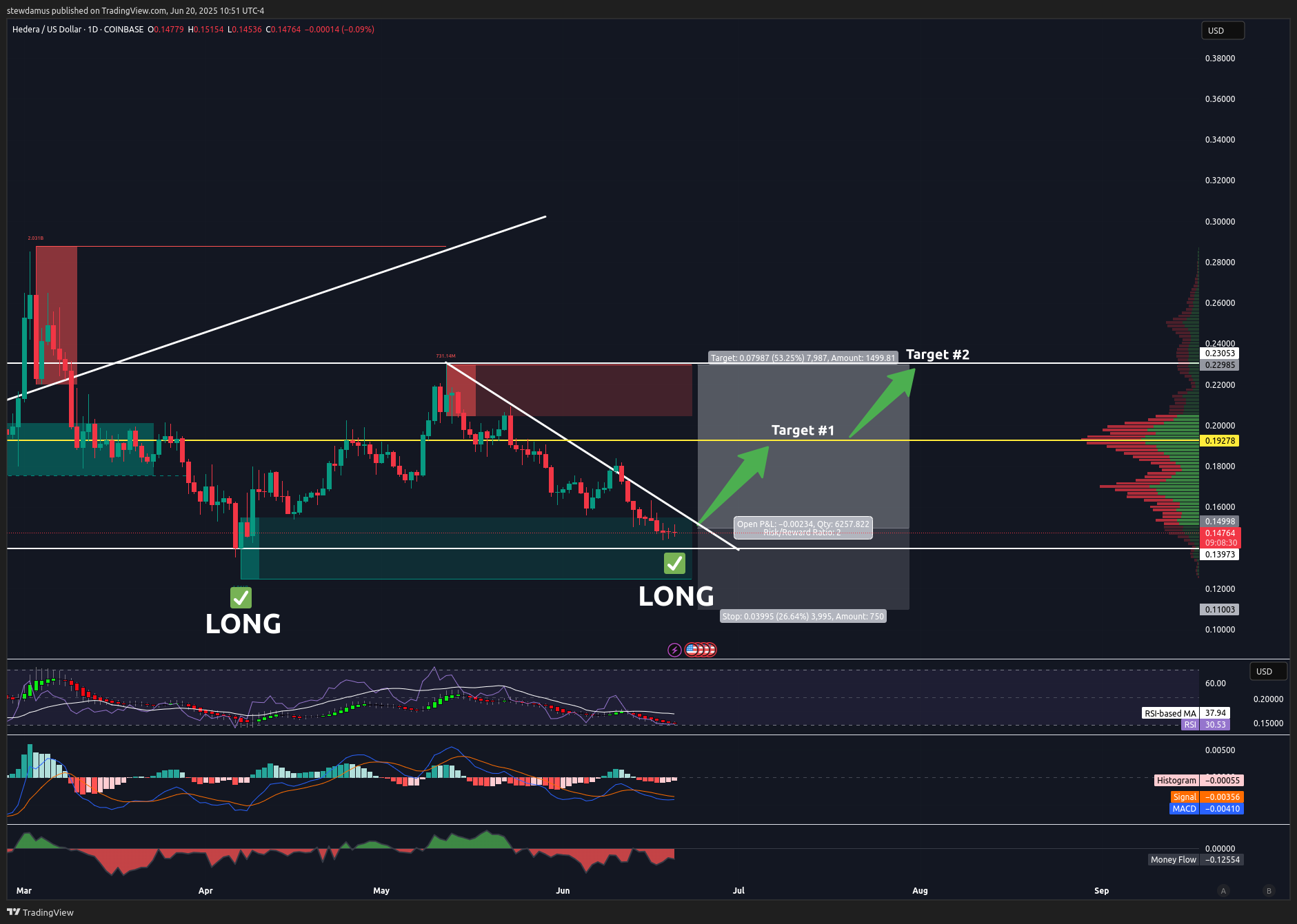 With that said, I've long been waiting for my indicator to give me the signal on this outstanding altcoin, HBAR. I mean, it's been months. The last time it flashed green for me, we went from 12 cents to 24 cents. Unfortunately, my cash reserves were locked up in other trades. Today is different.