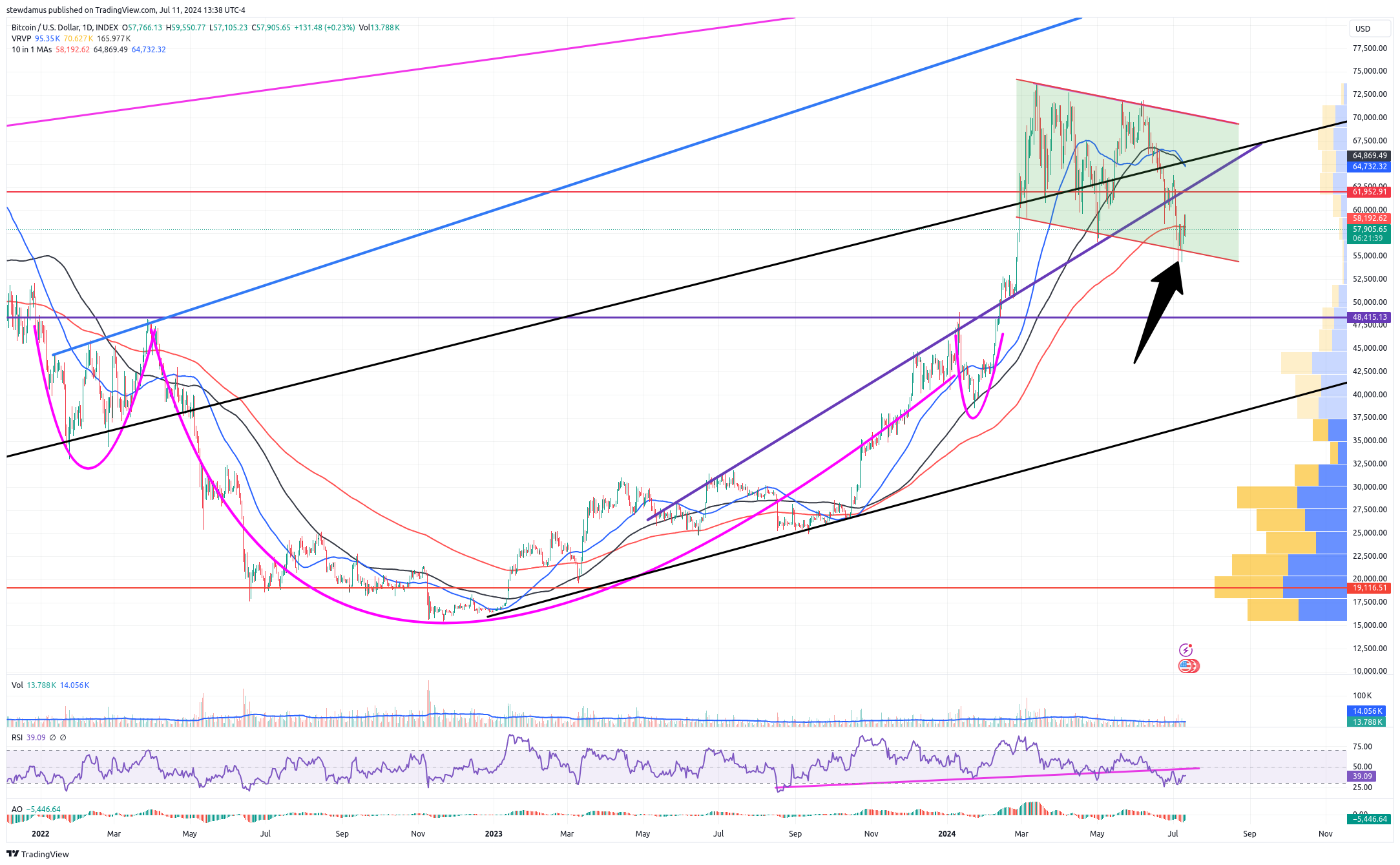 Title is straight and to the point. We are now on the bearish side of our trend lines. Though, long-term, Bitcoin remains bullish and is, in fact, inside of a long-term bullish channel (bull flag), if we drop from this channel then 48k will most likely be retested as support. 48k, if you remember, is the neckline of our long-term inverse head and shoulders pattern. Typically, price likes to retest significant levels like this one. It hasn't done so since we broke out in February. Will we do so now? Watch that channel for your answer.
