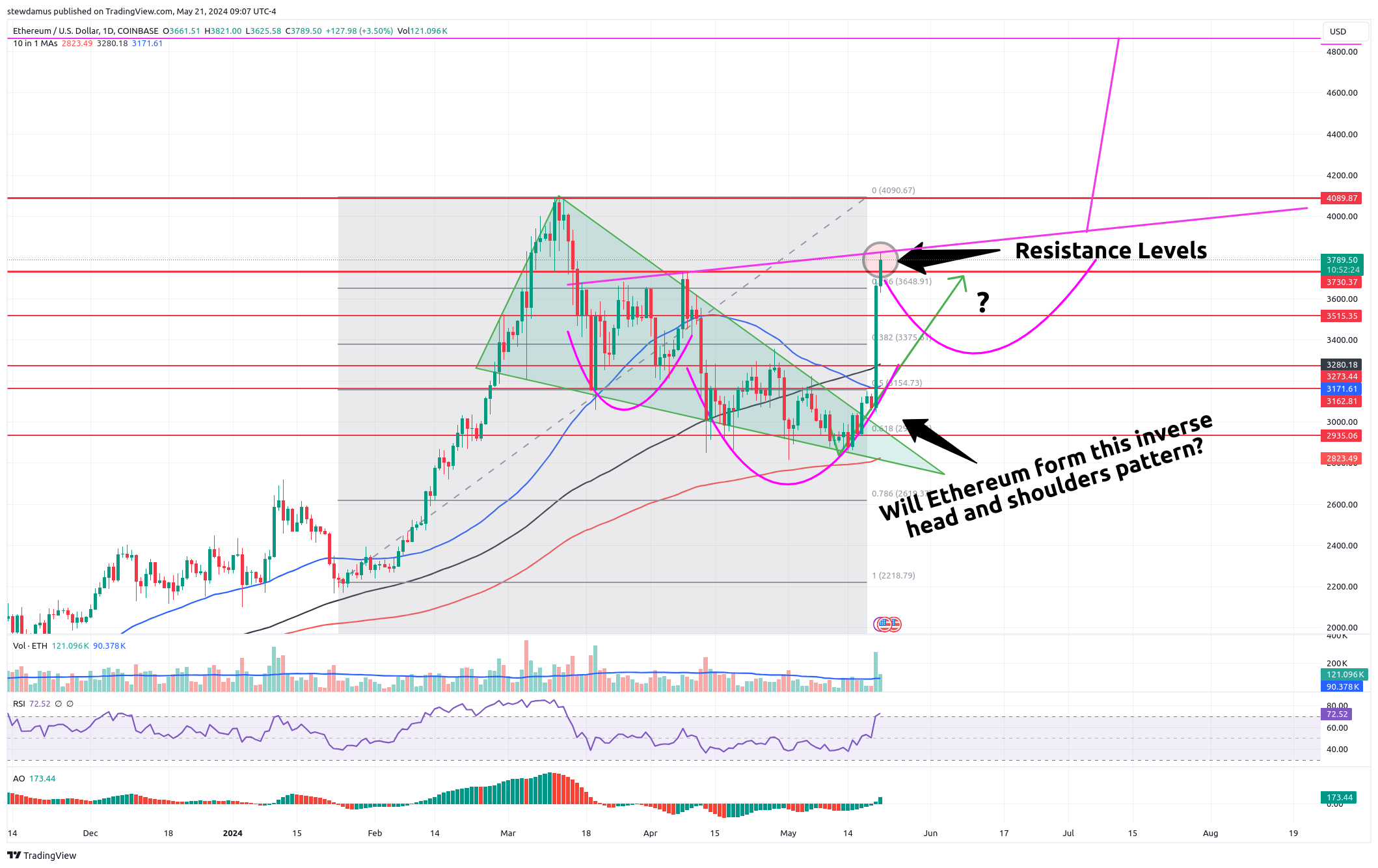 I have a pretty good record for calling these inverse head and shoulders patterns before they are fully formed. I am not saying for sure Ethereum will form this inverse head and shoulders pattern but if it doesn't, then it will need to break above those resistance levels I have drawn and confirm. If it can't do this on the daily, then I have a hunch this inverse h&s will complete itself.