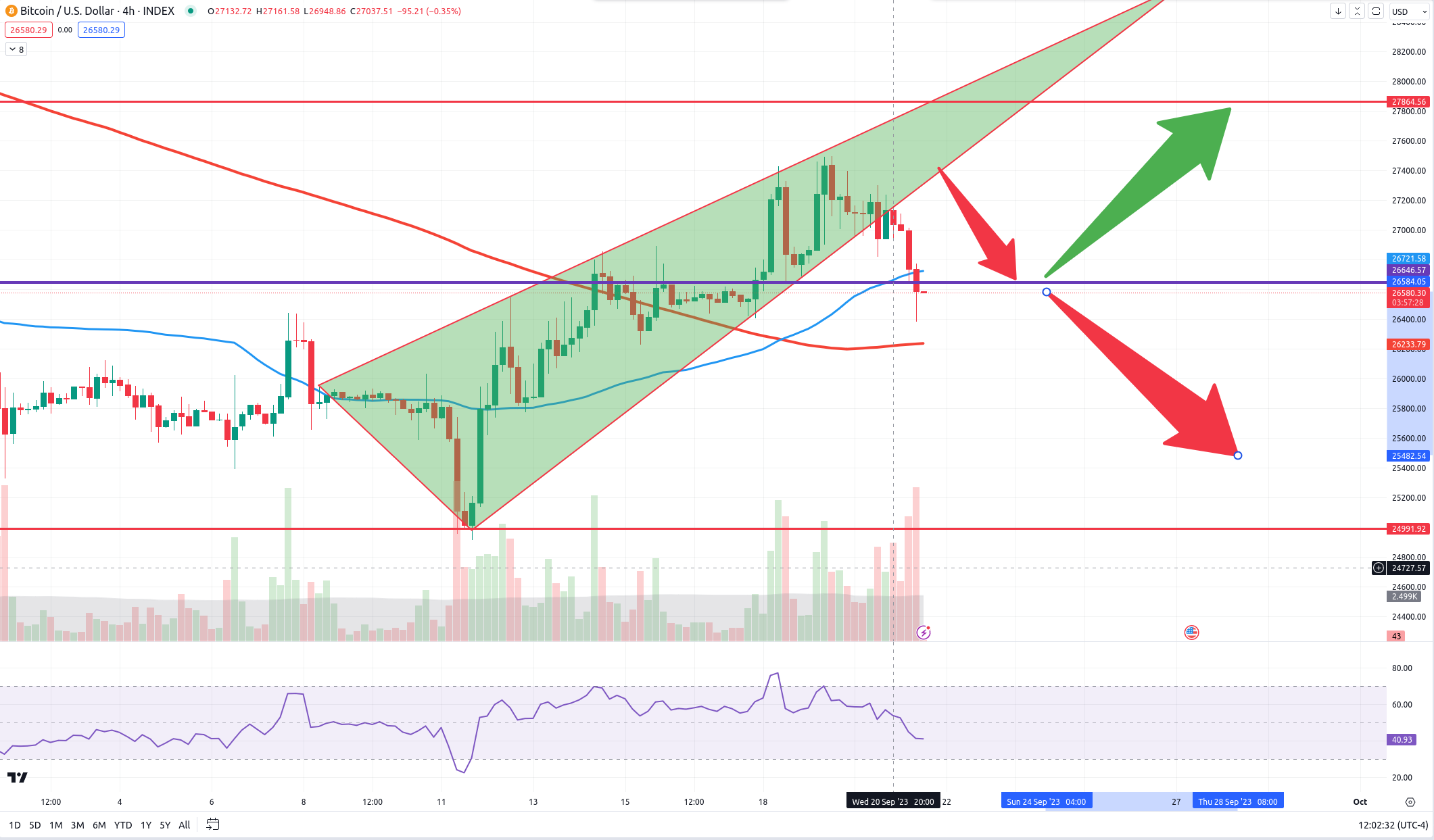 P.S. - Also a quick update on BTC’s 4 hr. chart below. Yesterday, I posted that we would break down from this bearish triangle pattern soon. This we did. Now we are on the 26500-26600 support again. If this holds, we should continue back up. But if it breaks, as I stated in yesterday’s post, we can expect to test the 25200 neckline area yet again! I know. I’m tired of this area also. But stay with me. I promise we are getting close to another crypto bull run soon. And it will be worth the wait.