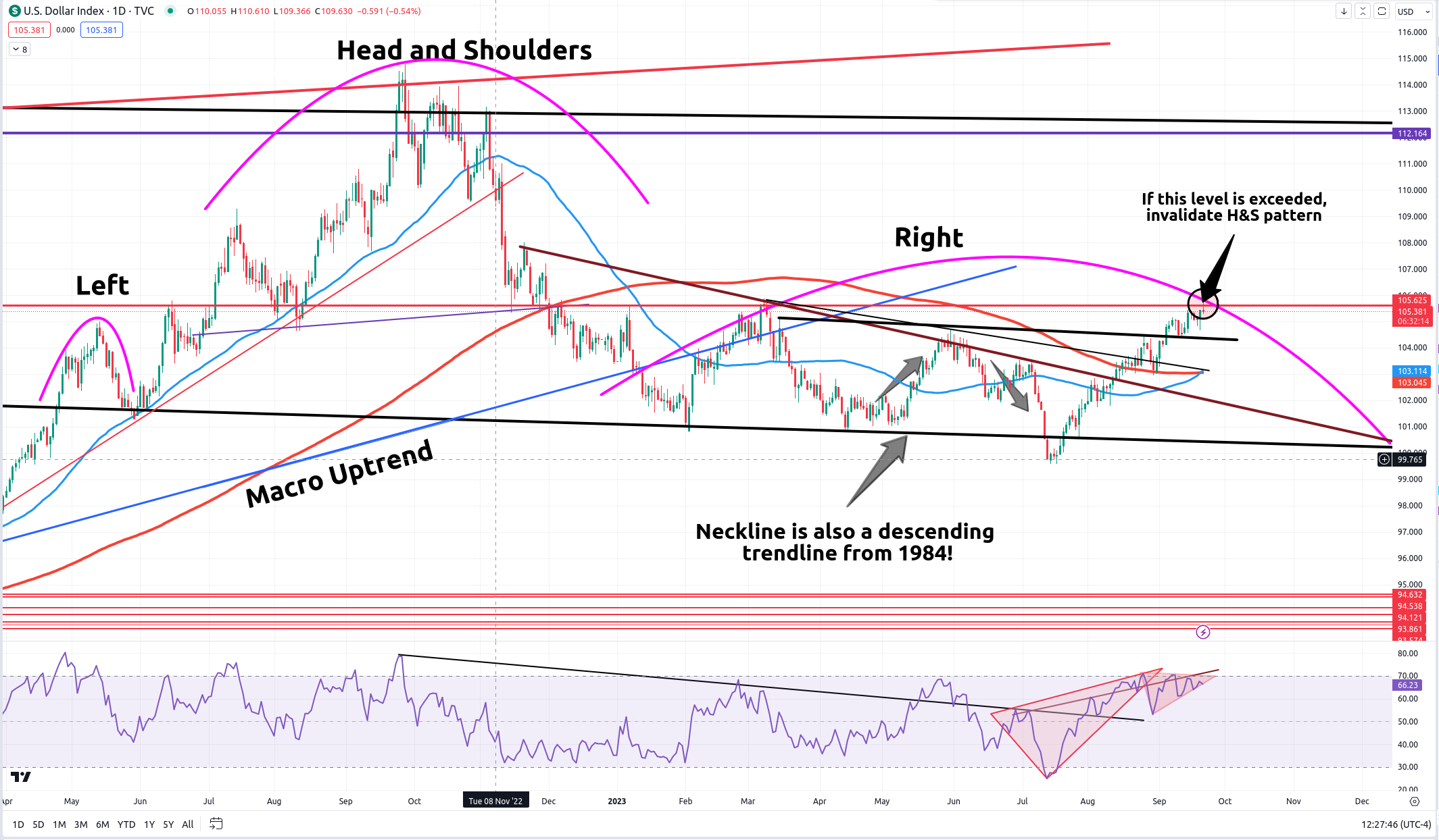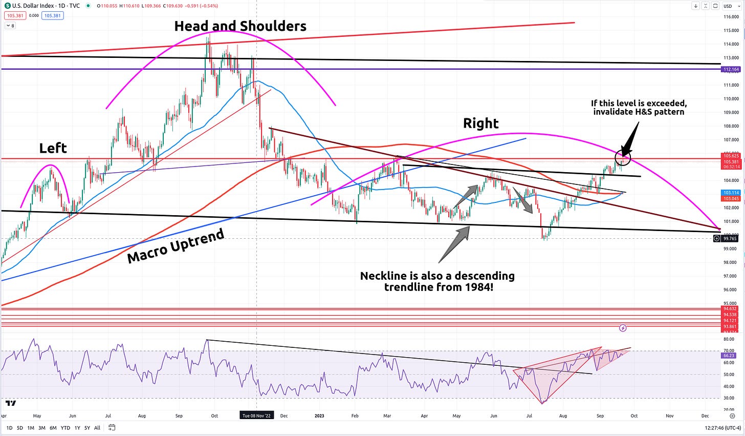 We now have what looks to be a completed H&S pattern formed on SPY. Currently, we are testing this neckline support. But we need confirmation to know whether it will be a break or not. Tomorrow we should find out. Until then, I am watching this along with the dollar chart (below) closely.