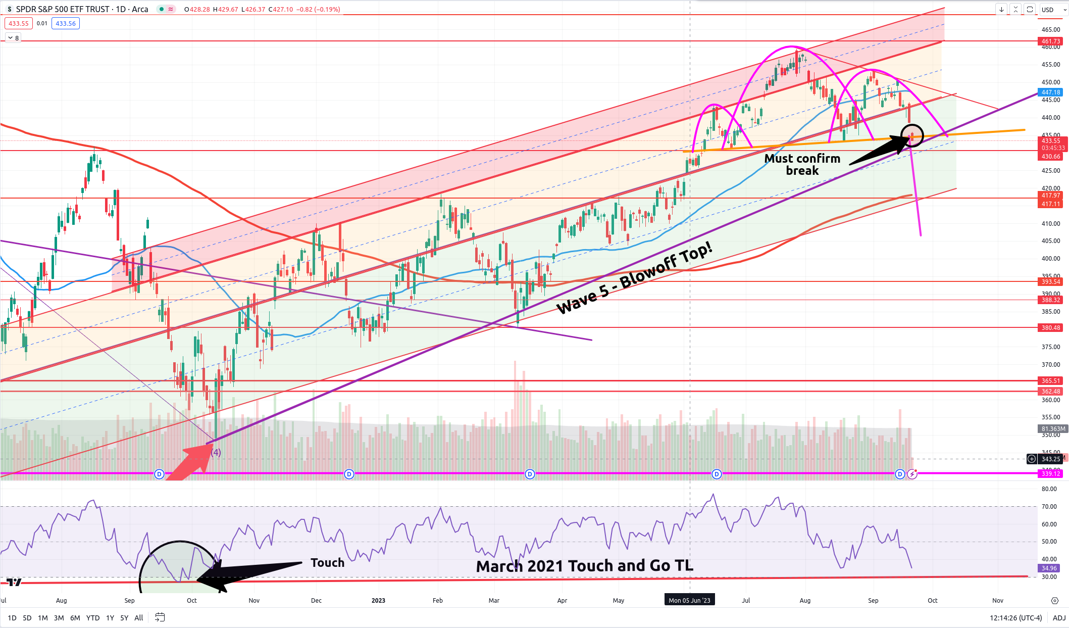 In yesterday's post, I hinted at the fact that it looks as though SPY's upward trend, irrational as it may seem, will continue, fulfilling my blow-off top thesis. I still believe this to be true. However, along the way up, there will be obvious pullbacks.