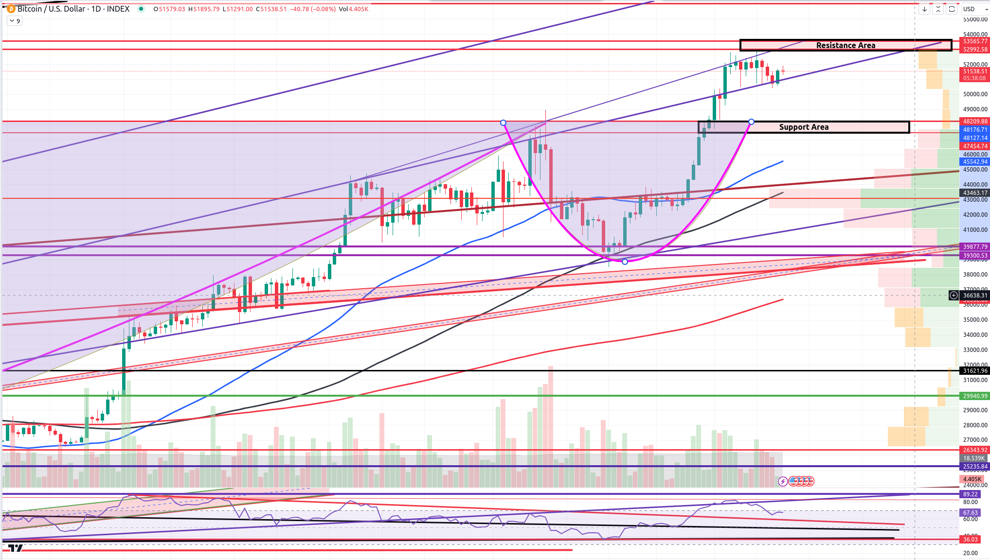 To conclude, if we don’t see a pullback in Bitcoin soon, this sideways action, much to the shock of many analysts, may be all that we see. At most, at this point, I would be happy with a retreat and touch of the 48k support area before we hit new all-time highs this year.