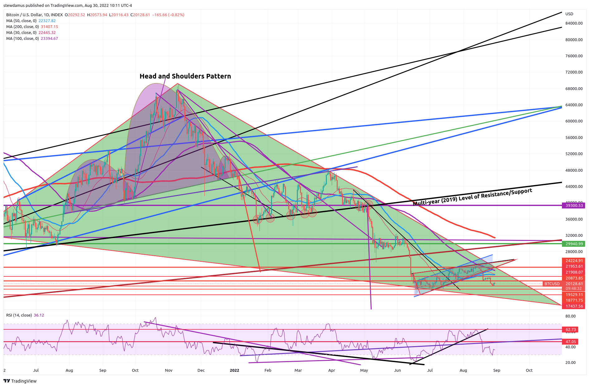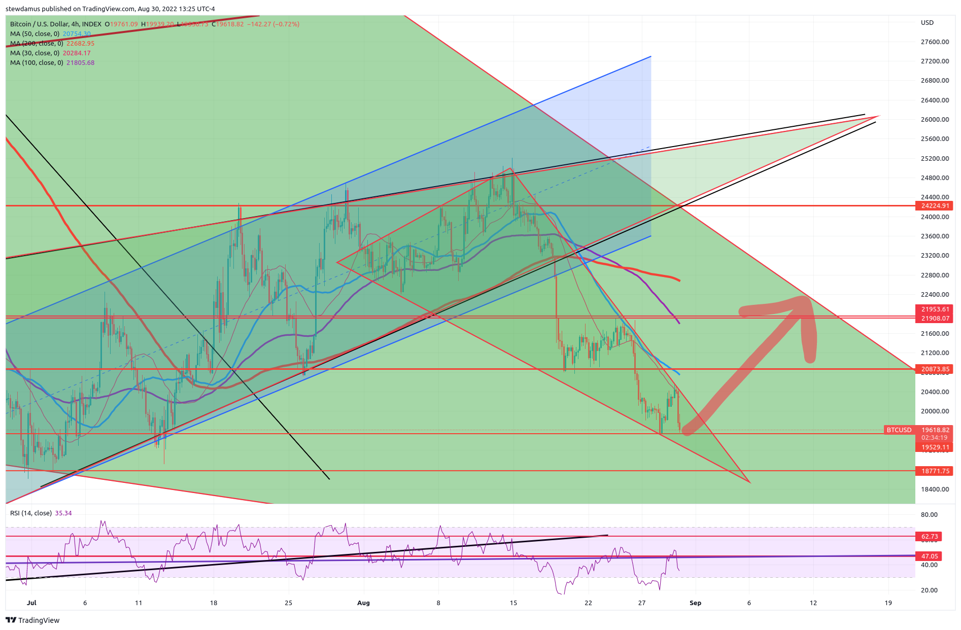 And if you donโt have time to watch it, basically, the short and skinny is that we are drawing near to that Sept 13 date when new CPI data is released and the FED makes further commentary on it. All the charts and indicators point to some big moves happening around that time frame. Could go either way but I am fairly optimistic about what the charts are showing me. Take a look at Bitcoin for instance: