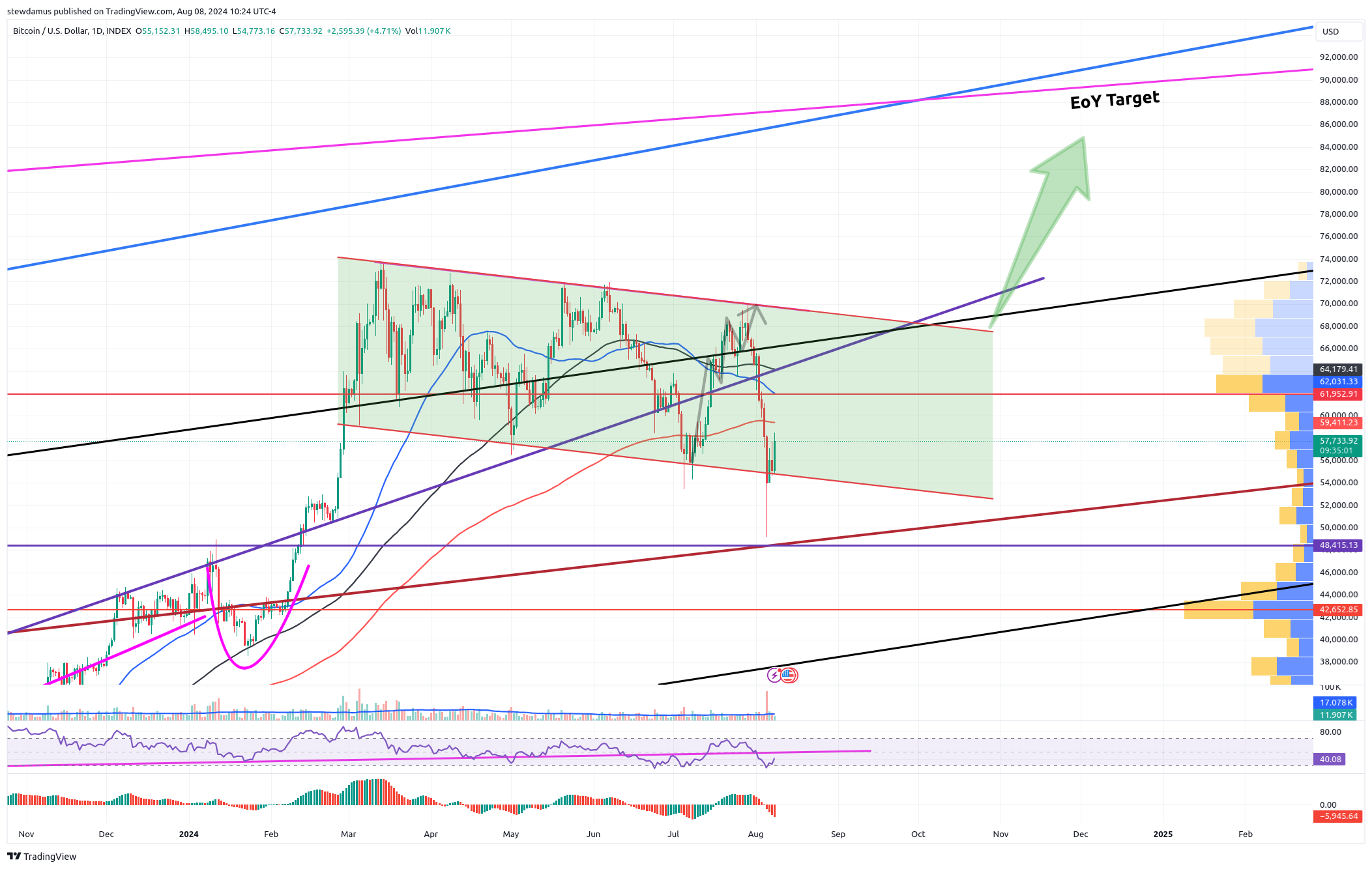 I’ve sold all of my profitable trades at this point. One of our trades grossed us 88% in two days. And though I think there will be more of this to come in the future, I am on the fence right now about Bitcoin. From a technical perspective, we have not created a new high daily candle to reverse our downward trend. So, even though we did close up and inside the channel and we confirmed that yesterday with another candle close inside the channel, to be sure we are going to move further up, we need to beat that previous candle body of 58,200. Because we haven’t done that yet and also due to the fact I will be traveling for the next week, I’ve decided to unload all of my high-risk trades that were in the profit. Should we beat that 58,200 level on our Bitcoin chart below and confirm with another candle open and close above this level, I may jump back in with a trade but it would most likely be a Bitcoin-only trade. All higher-risk altcoin/memecoin trades will likely not be an option until I return to my desk and can monitor price action more closely.