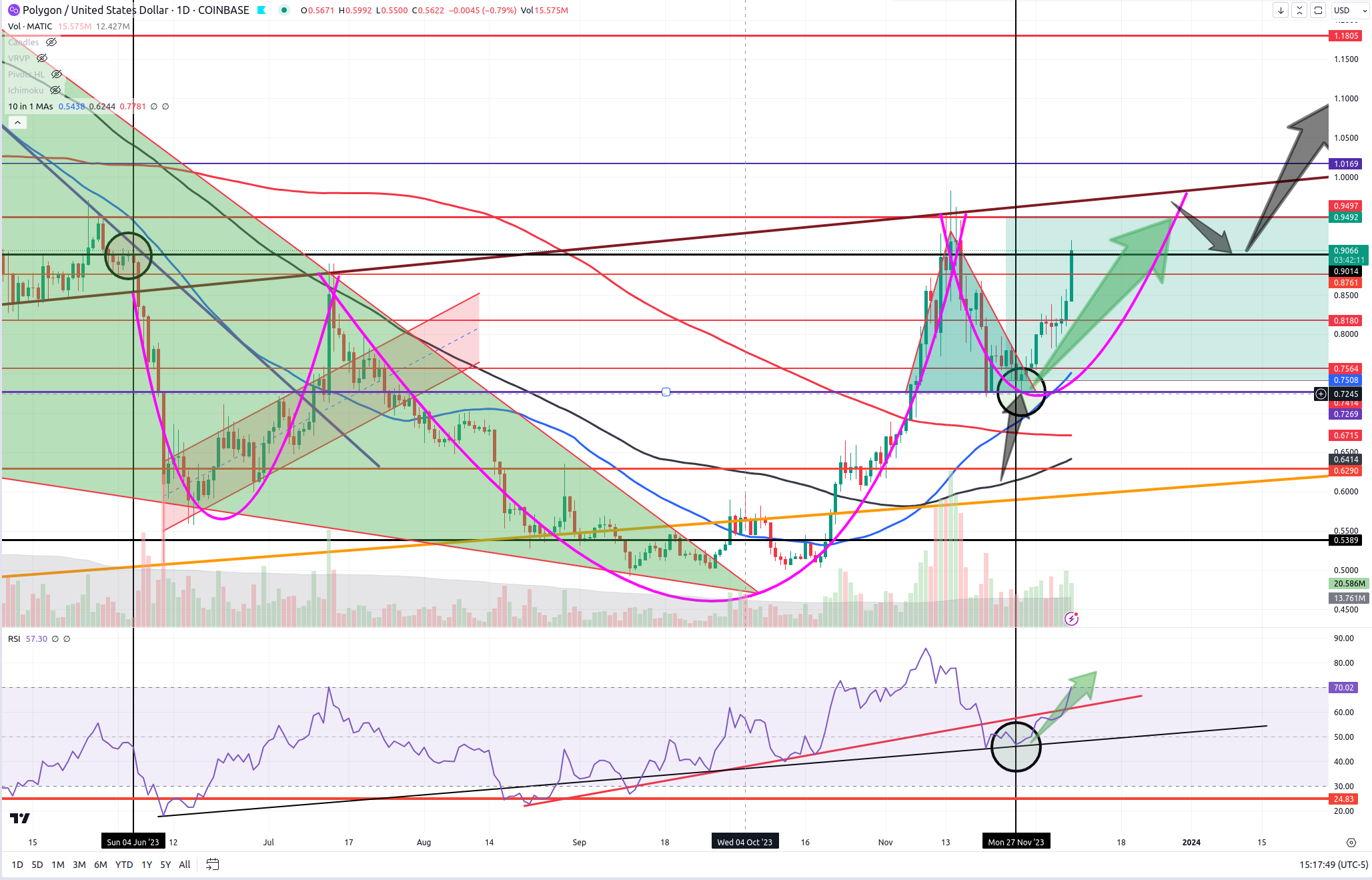 It’s been a good week. Feels good to pocket those gainz. This week I had a bit more time to monitor the alts and so there was a lot of action. Today I had off and was able to make quite a few moves. Hopefully, most of them good. Because I won’t be tied to the screen all weekend I just wanted to wrap up what I could to keep me as safe as possible should we take a sudden u-turn over the weekend. I don’t expect that, but then again, crypto never fails to surprise us when we least expect it. That said, I sold Matic and am 100% out. It’s up against resistance and I didn’t want to wager whether or not it would reach my final target. 21% profit is something I’ll take all day.