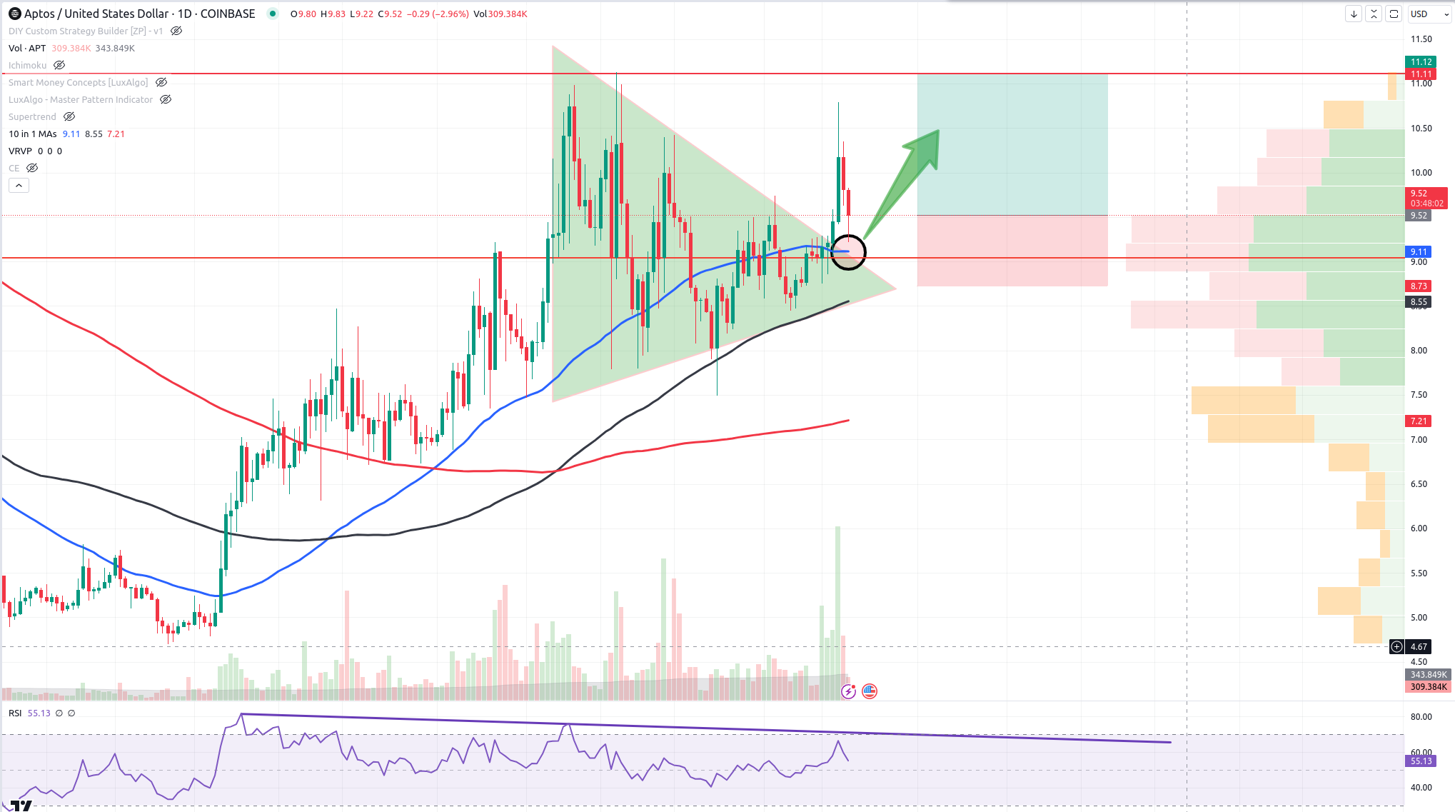 I’ve got another trade for you all here in Aptos. Nearly all of my signals are flashing green on APT. I can’t sit the sidelines waiting on Bitcoin here. I’m in at $9.50. Targeting $11+. SL is $8.73 (just under the VRVP PoC) for a 2/1 rrr.