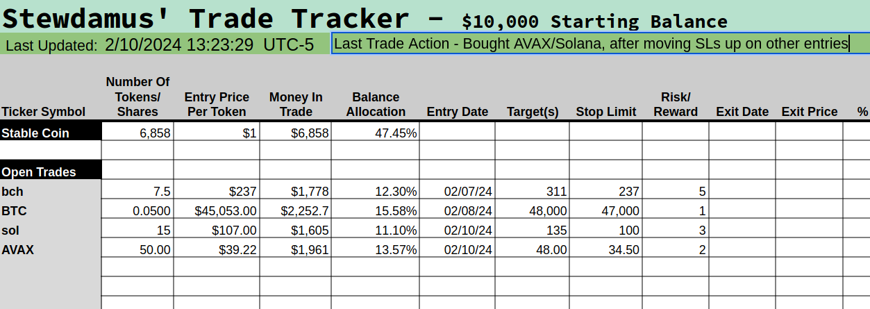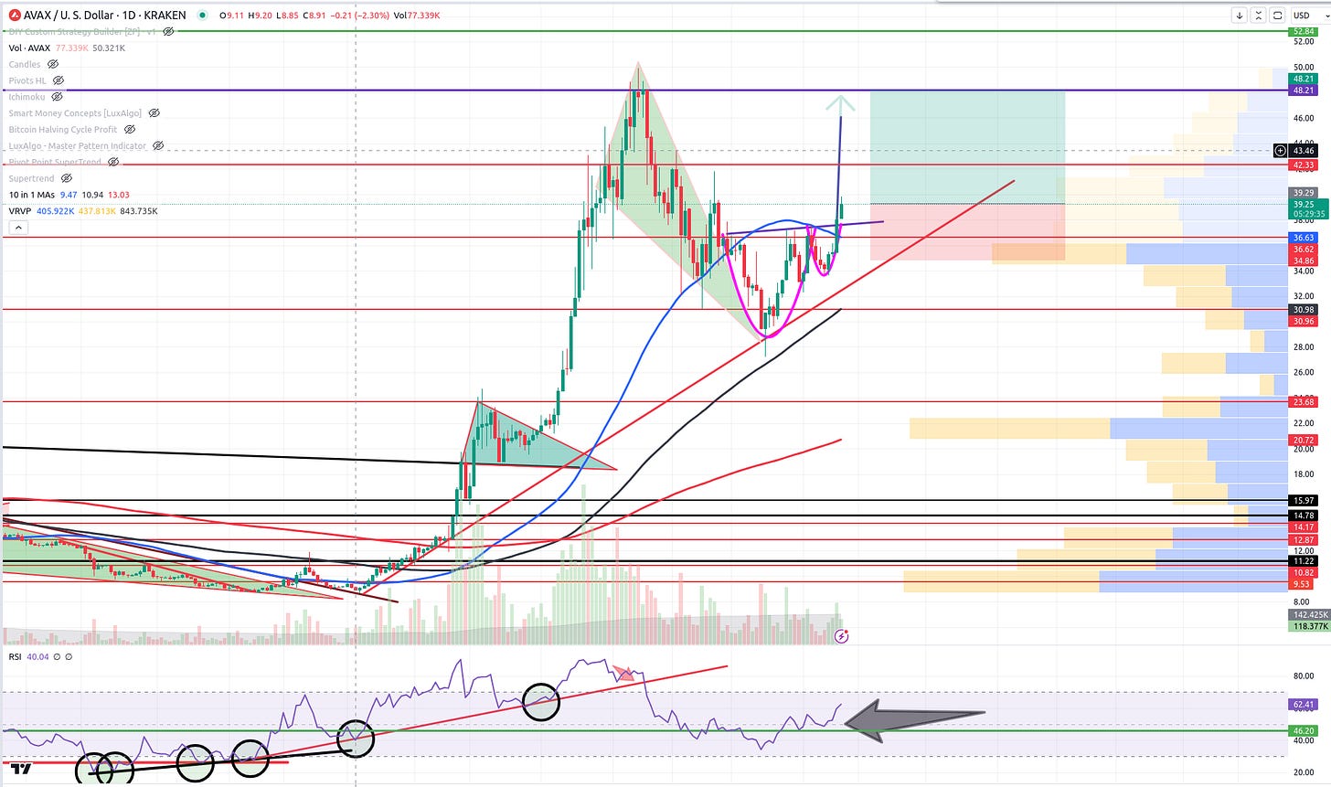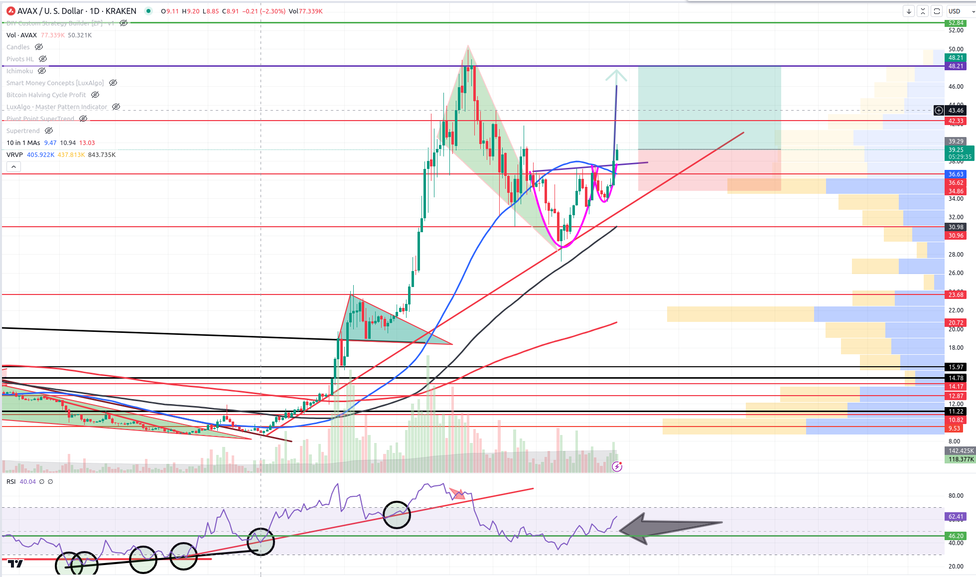 I suspect AVAX will form a double-top before more pullback. Cup and handle pattern is now in play and takes us just shy of our $48 price. I plan to some (maybe half) of around 42. I will then move my SL to break even and let the rest ride, trailing stops as we go.