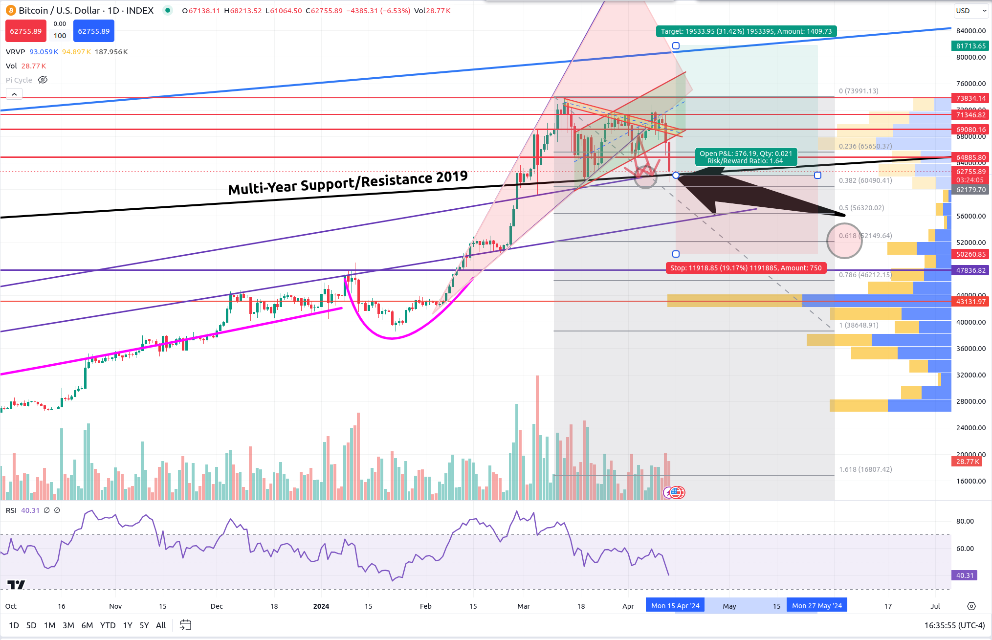 Bitcoin has hit my multi-year support/resistance TL again where I promised I would be a buyer. And I am. Entry 62k. Target 81k. SL 51k. RRR 1.6.