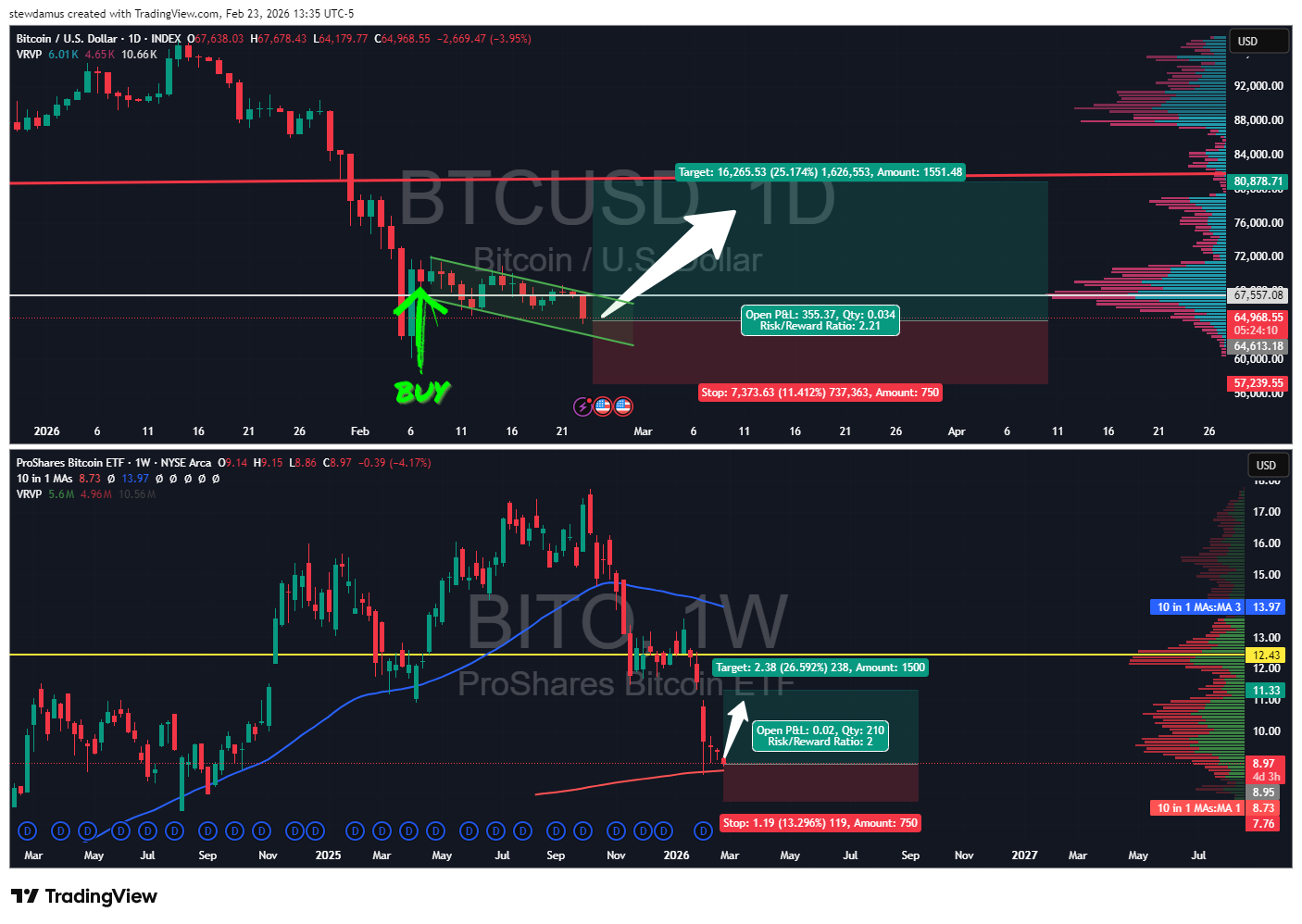 In this case, we are in extreme fear, and my Pivot Zones Indicator has flashed a BUY signal. This was given on Feb. 7th and has now been confirmed with a large liquidity block. On the Bitcoin price chart, my indicator is very accurate. Therefore, I have a high degree of confidence that I can take this trade with minimal risk. I will be trading the BITO etf in this case.