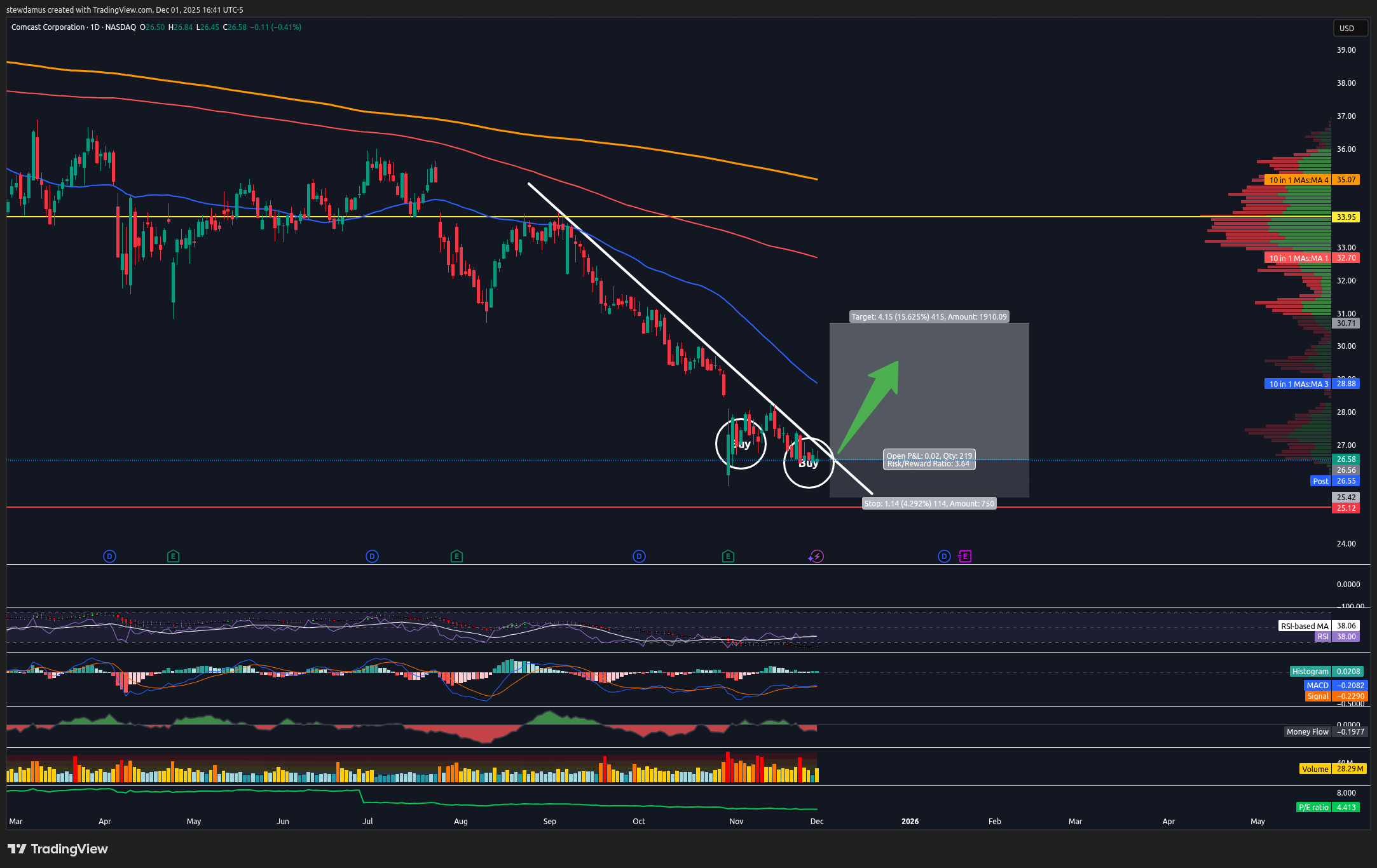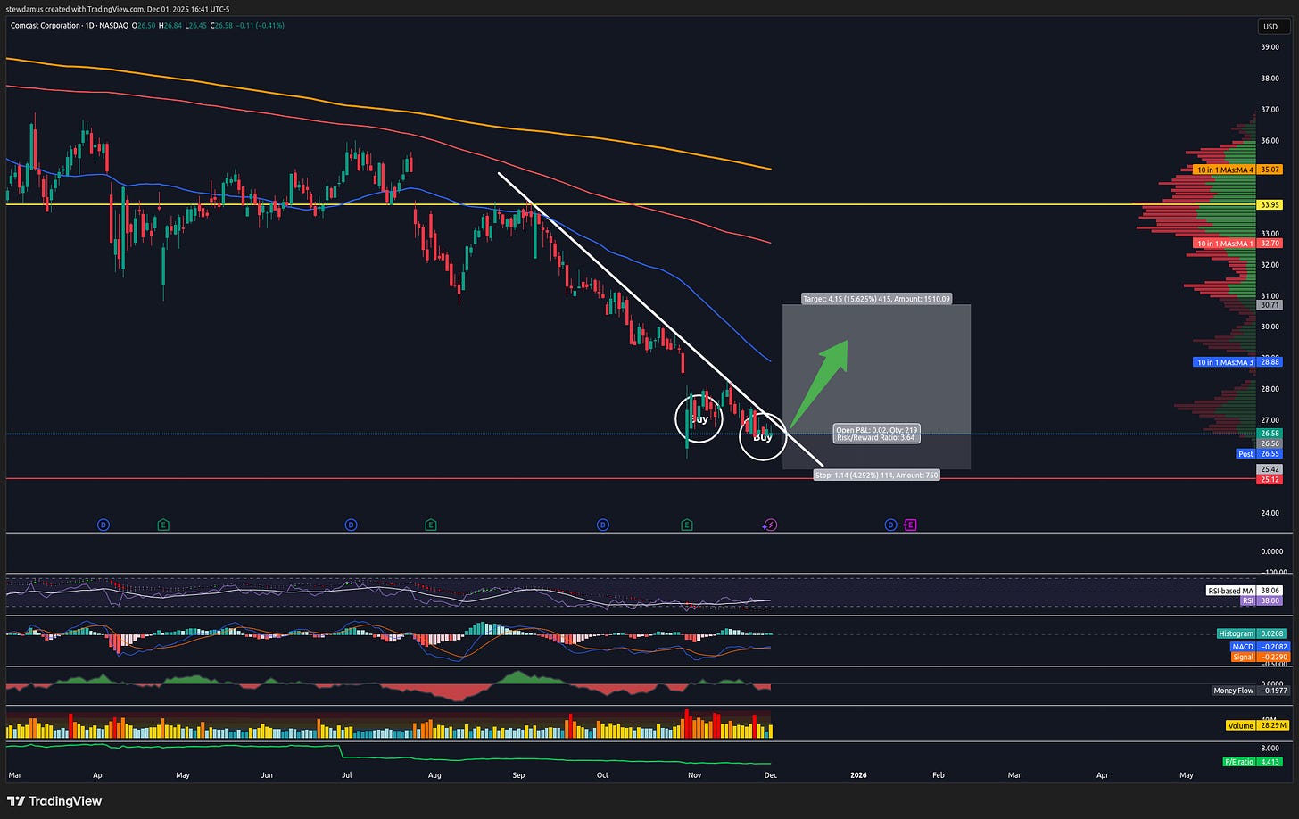Not getting many long signals from my indicator these days. When I do, I pay attention. In this case, I’ve received two long signals on the same stock. Though I am currently only short (and in the profit on both: TSLA and PLTR), I’ve decided to enter here long on Comcast. My indicator rarely fails me when it signals on these high MC/high vol. stocks. So, I will listen.
