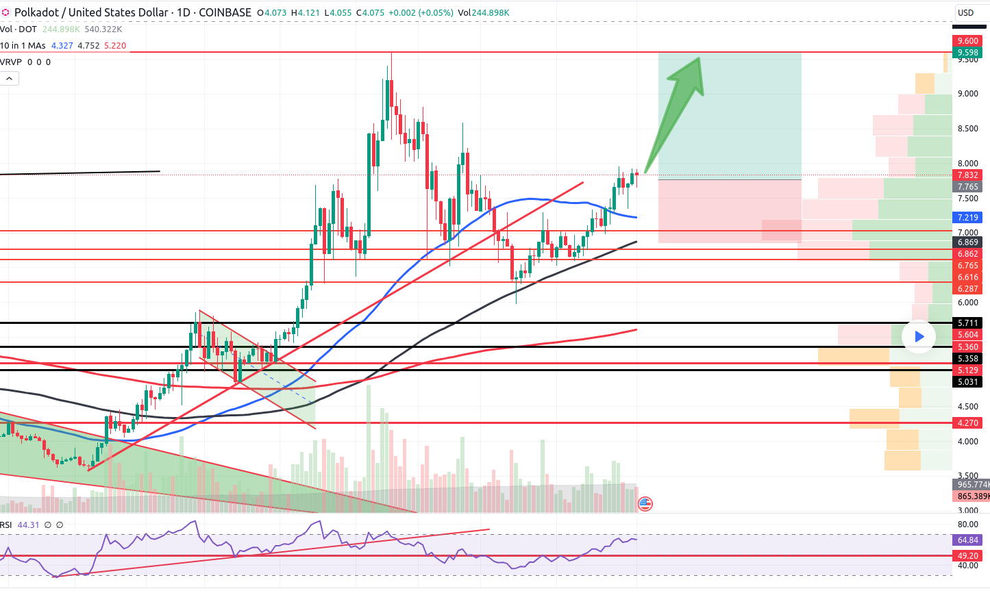 Another trade I've taken today is here on DOT. Once again, my proprietary blend of custom indicators are all flashing green. Reinforcing the bullish signal is, of course, good volume support on the underside of price along with all SMAs (50,100,200). RSI is hot but not in overbought territory as, it would seem, everything else is. I can see us double-topping before any sort of pull-back. I'm in at 7.77 and targeting 9.60. My SL is at 6.86 with a RRR of 2-to-1. Potential gains here top 23% to our final target.