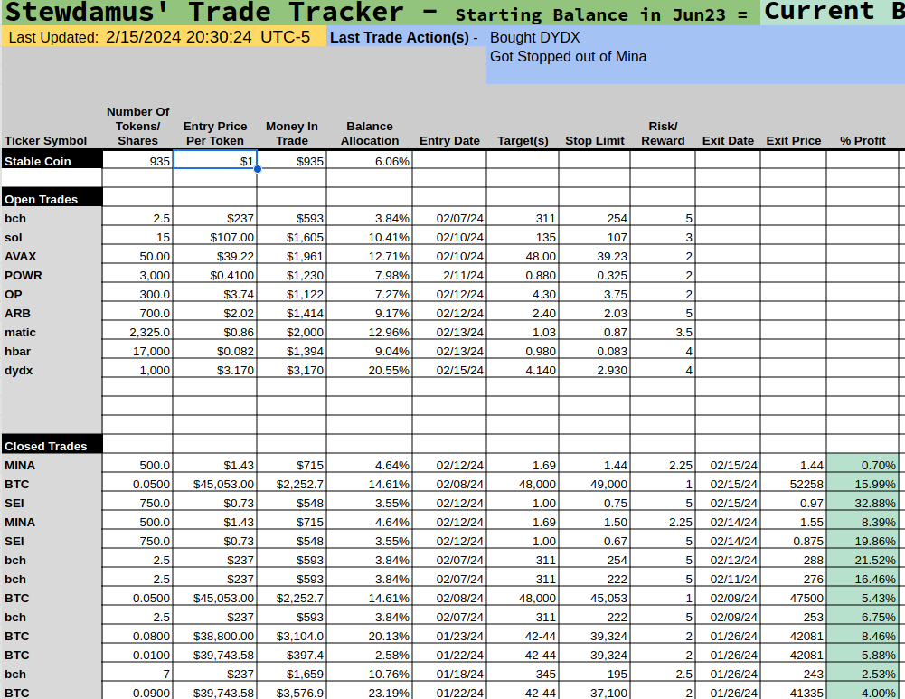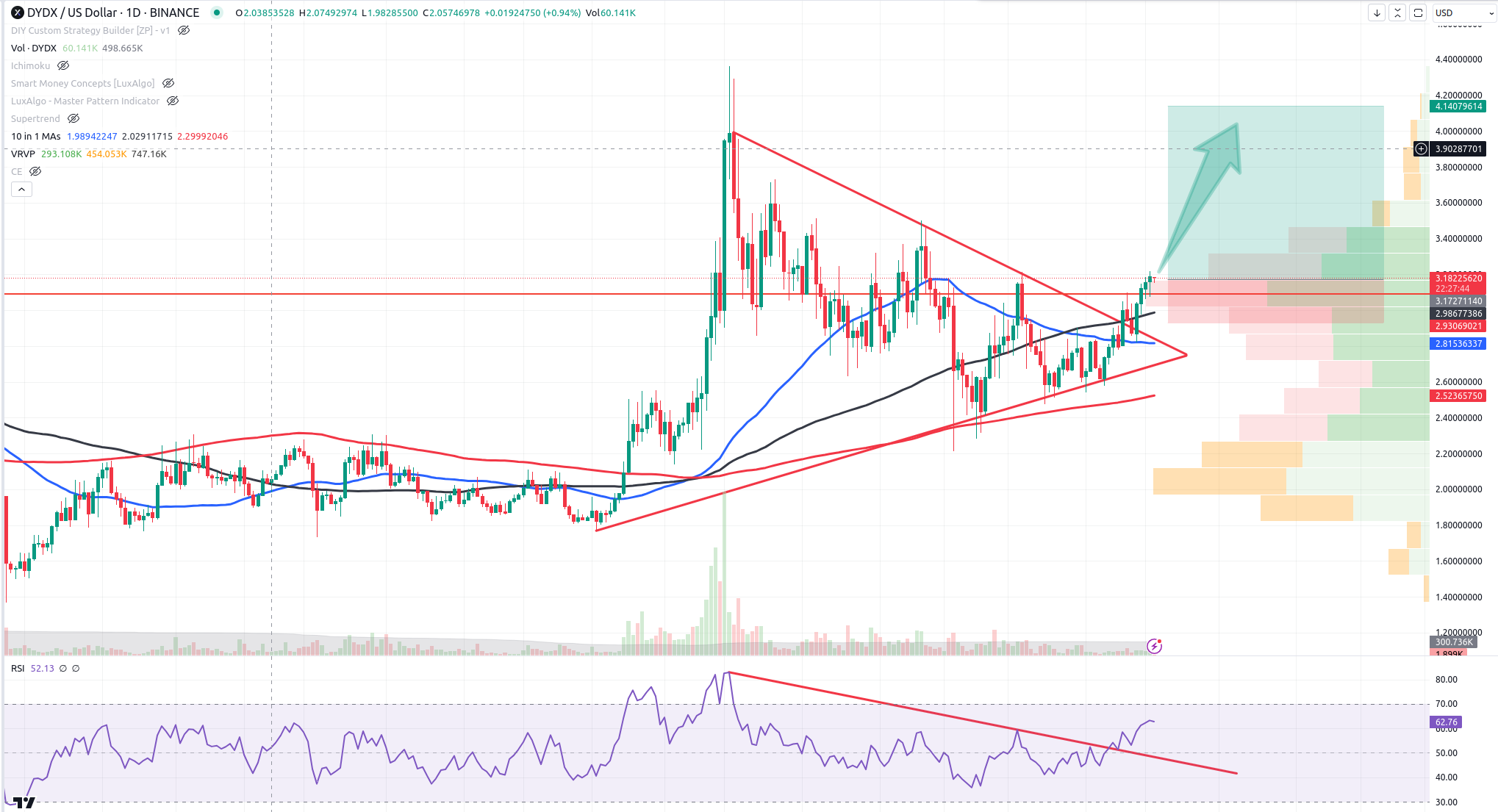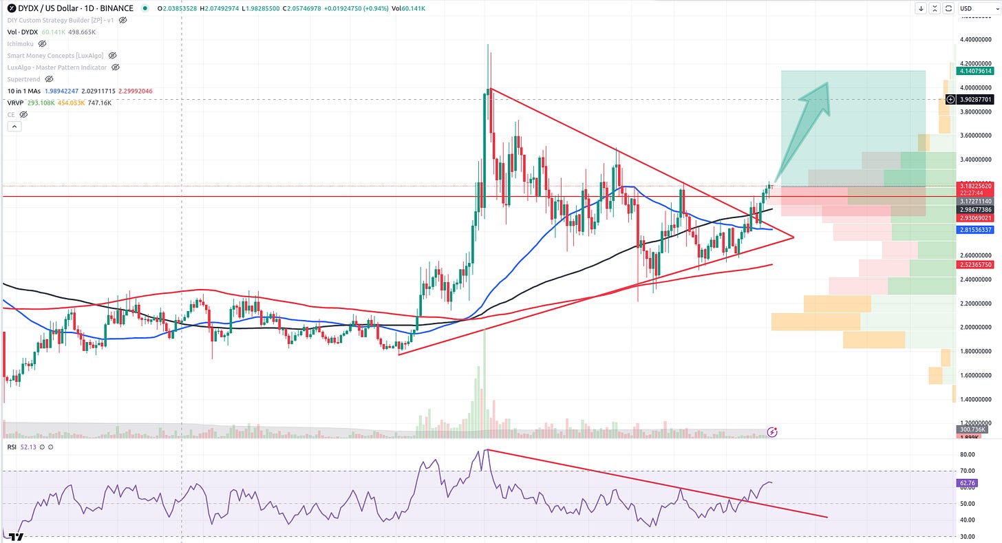 Well, I was stopped out of MINA for a tiny profit on the last half but a decent 8%+ on the first half. There are still a ton of bullish coins out there to pick from. My next pick goes to DYDX. You can see we have a breakout from a bullish triangle and a solid point of control just under us on the VRVP. Iโll target somewhere around the double-top area (4.14) for a 4/1 rrr. SL will be 2.93. My port weight is 20% on this one. That should tell you how bullish I am.