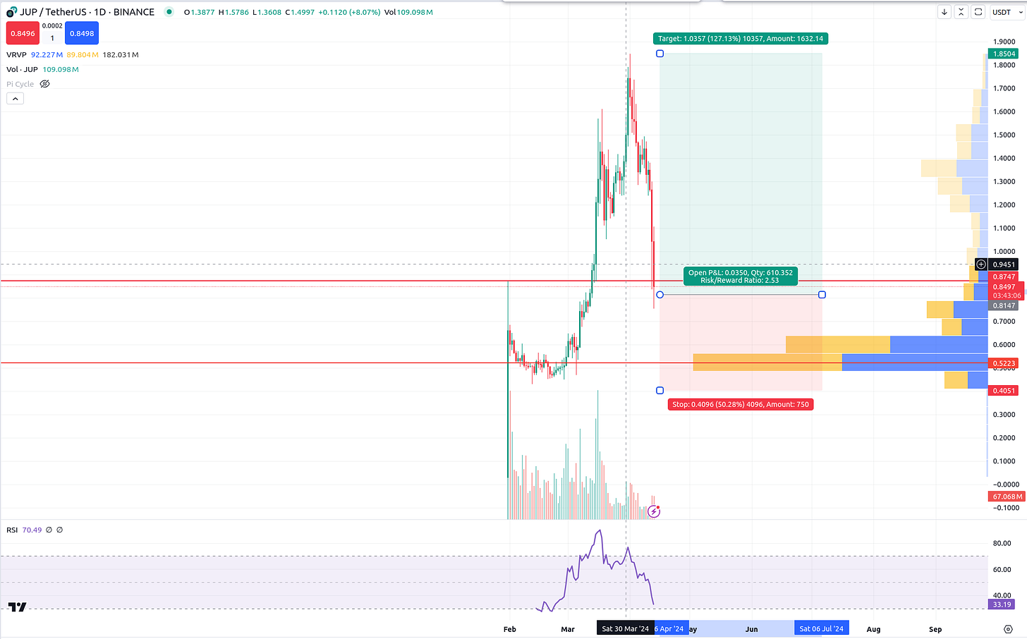Is this reckless? Maybe. I don’t think so. I love the fear that is generated through these news-driven fear campaigns and I will buy it right up every time. Jupiter is an exchange that I use often. It is extremely undervalued here where I bought it at .82 cents. Target will be 1.85 with a SL of .40 and a RRR of 2.5.