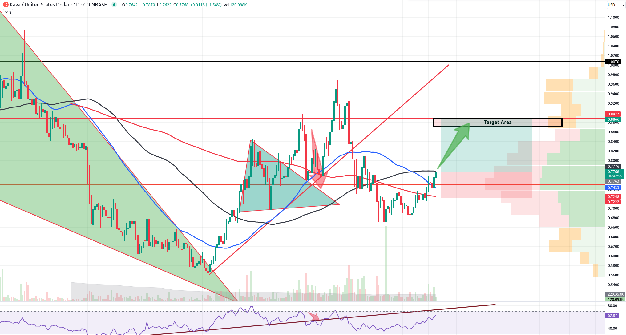 All my KAVA indicators are set to green and with our VRVP PoC under price as support along with our 50/200 SMA's, I think entry here in KAVA is of good value. I will be targeting .87-.88 cents with a SL just under the 200 SMA at around .72 cents. The RRR here is 1/2. Not bad for a likely 14%+ profit potential.
