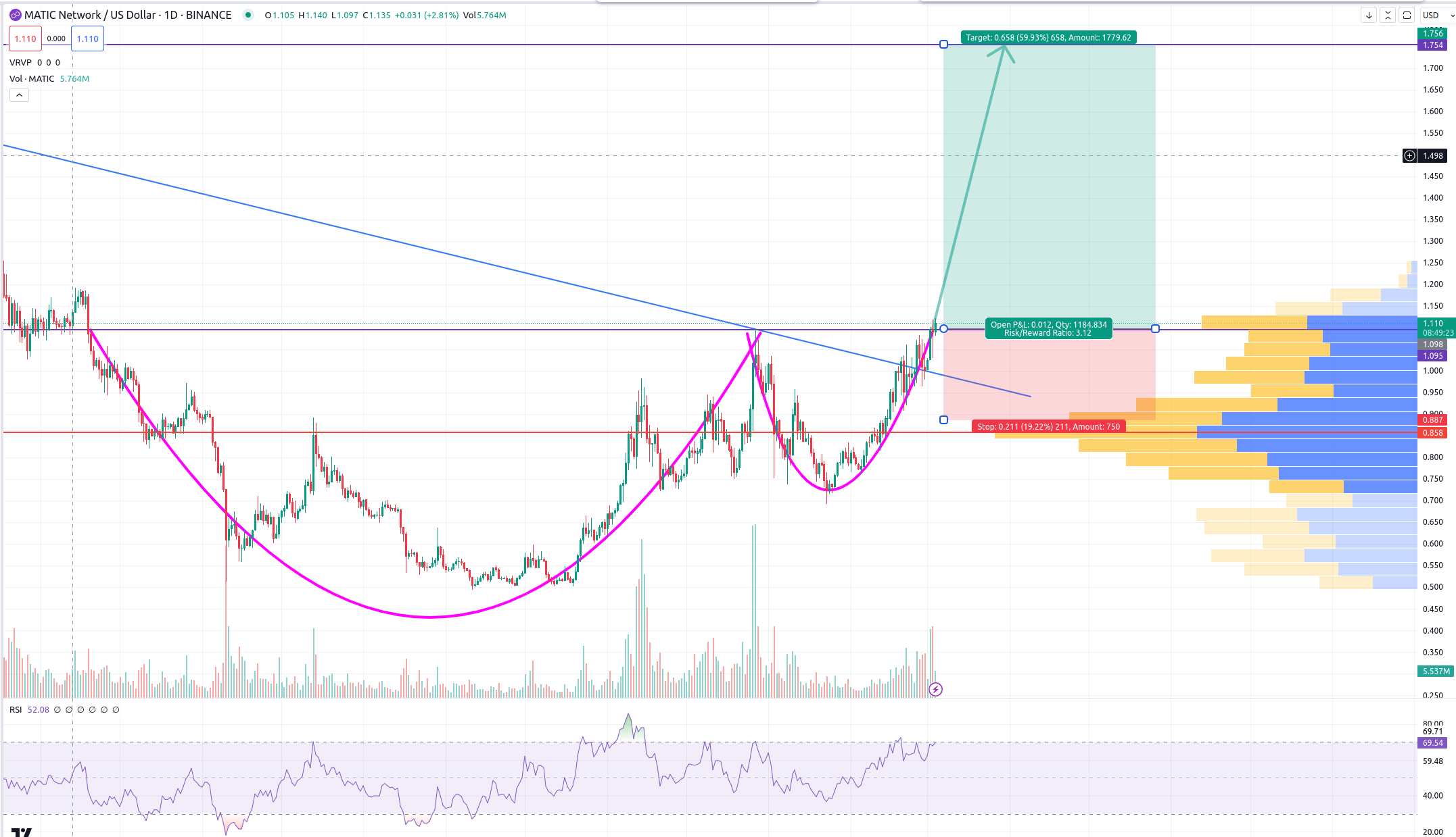 Matic looks to be breaking this larger and longer-term Cup and Handle neckline. Additionally, all of my proprietary blend of signals are flashing green rn. And finally, we have the bulk of our trading volume on the underside. Final target will be $1.75 with profit taking along the way. SL can be somewhere just below that descending blue TL, adjusting into time. RRR is 3/1 on this one.