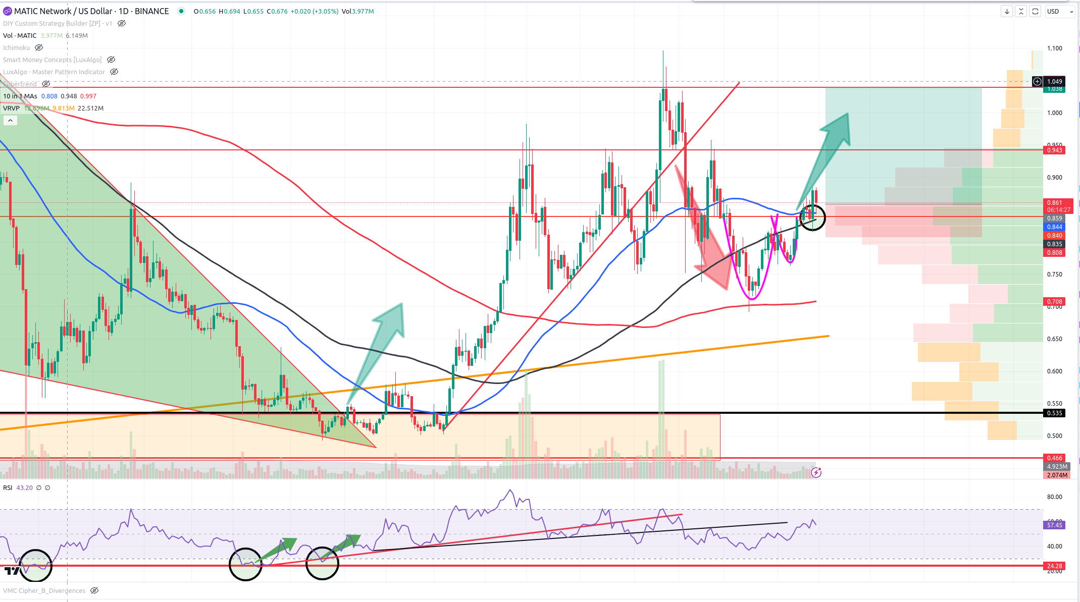 For my final long, I chose Matic. Nice little cup and handle. Above VRVP POC and above all SMAs. Entry was .86. Final target is 1.03 with profit taking at .94 along the way. SL is .80 with a rrr of 3.5 to 1.