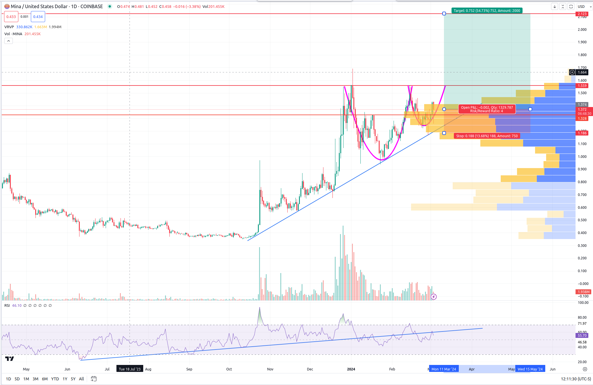 This is an early trade for me as that Cup and Handle pattern has not been confirmed with a break of the neckline. However, I am betting on BTC to 70k and it will drag these alts along. All good volume is on the underside of MINA rn, so we should see quite an explosion to the upside once that neckline is broken IMO.