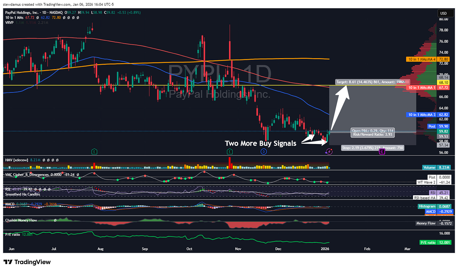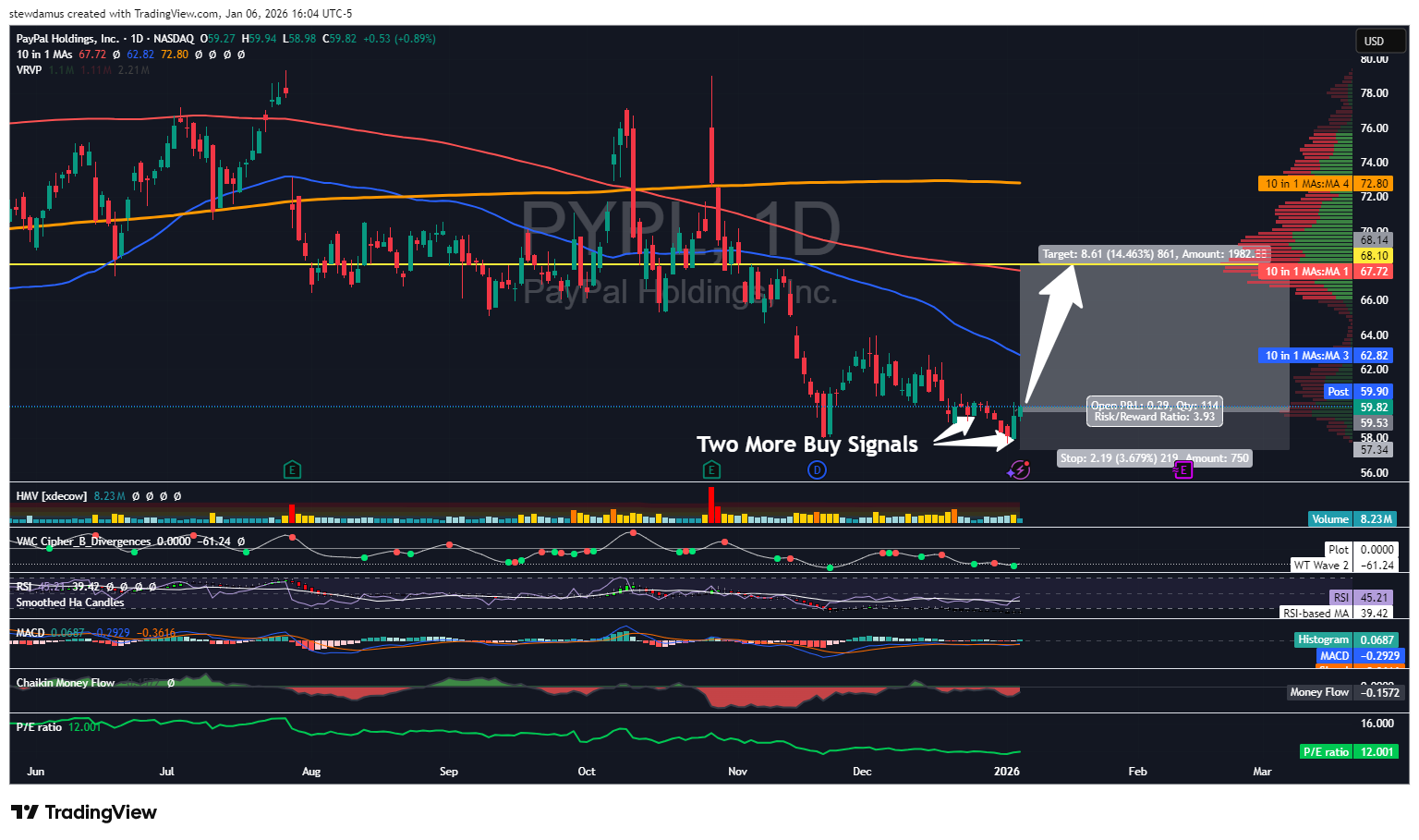 Because I kept my stops fairly tight on my last entry into PYPL, I was stopped out. I was okay with that. However, since that time, I have received two more buy signals with my Pivot Zones indicator. I can’t ignore these signals. I have re-entered at a price of $59.53 with a 1:4 rrr. Same target, but the stop is just below that last pivot low rn.