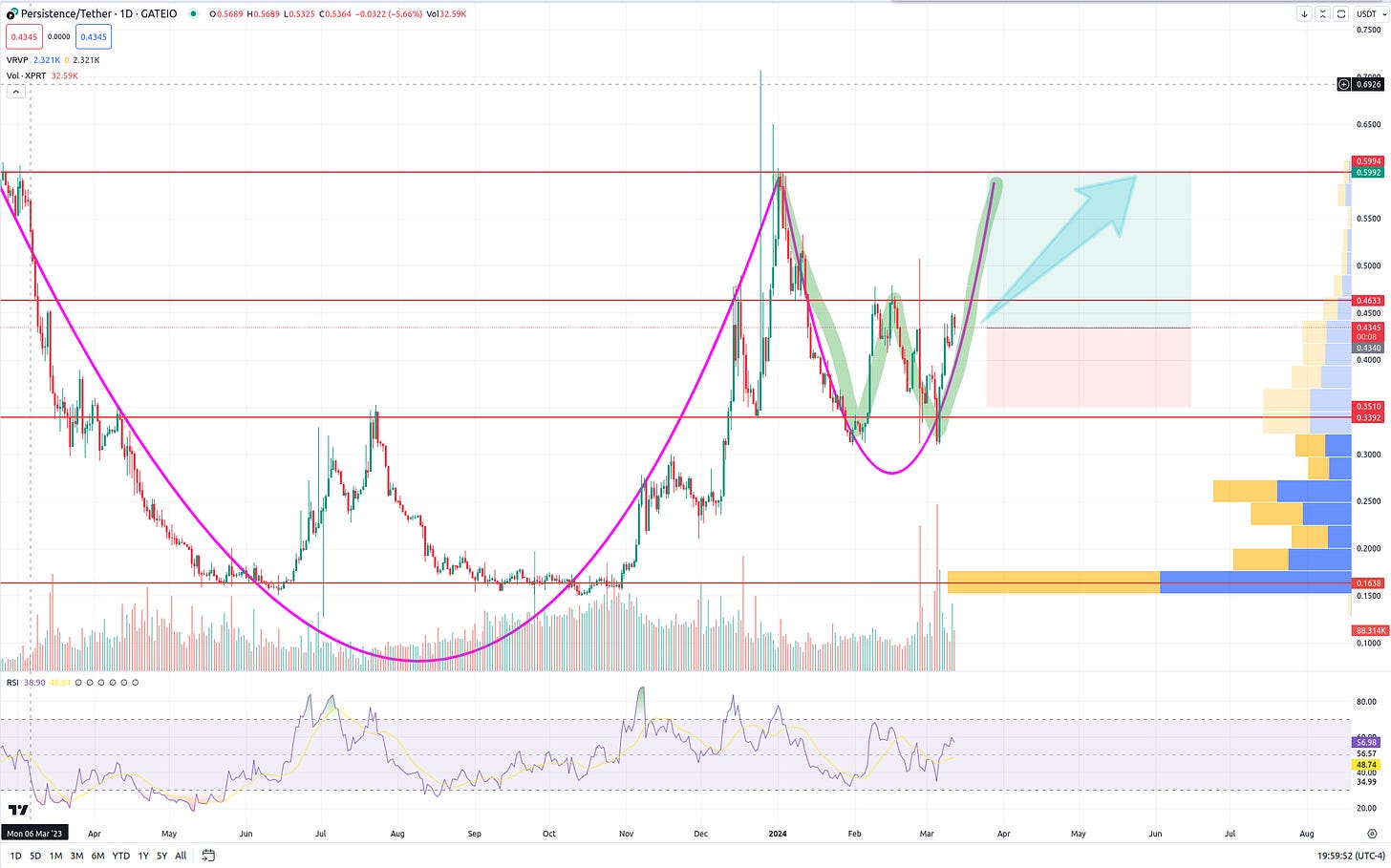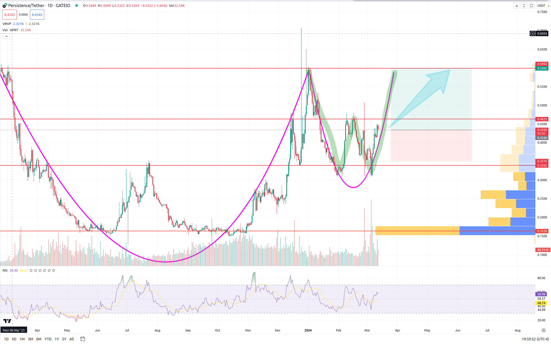 A coin that is honestly one of my long term hodl’s has popped up as very bullish recently. My proprietary blend of indicators are all flashing green. I’ve been learning to trust them as they are doing very well for me recently. Additionally, you can see that VRVP is indicating we are now in the “value zone”. A nice “W” pattern is in play. And the RSI is very reasonably placed. I’ve bought at .43 cents with a target of .60 (at least at first, as this is the neckline for a larger Cup and Handle pattern). SL is .35 and the RRR is 2 to 1.