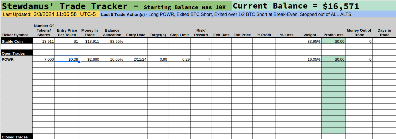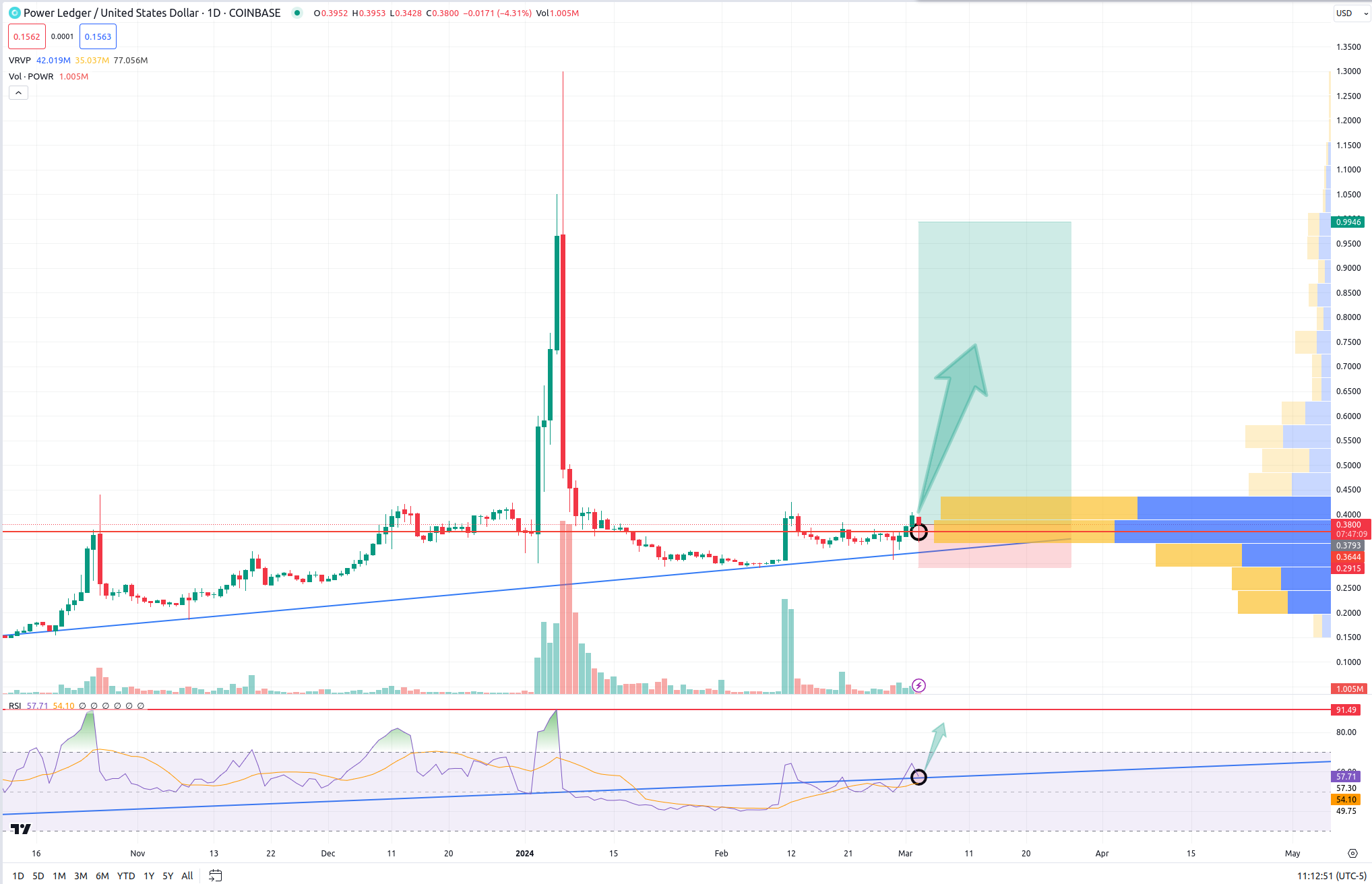 With BTC stabilizing above support, I think it goes to 70k next. This will drag ALTS up along with it. I am going to start dipping back into some of the previous positions which I was stopped out of with all the volatility. One such position was POWR. I like POWR here above the VRVP PoC and above that long-trending RSI support. I don't know if it will go to a dollar again but that will be my final target rn with profit taking along the way. Entry was .38 with a SL of .29 for a rrr of 7/1.
