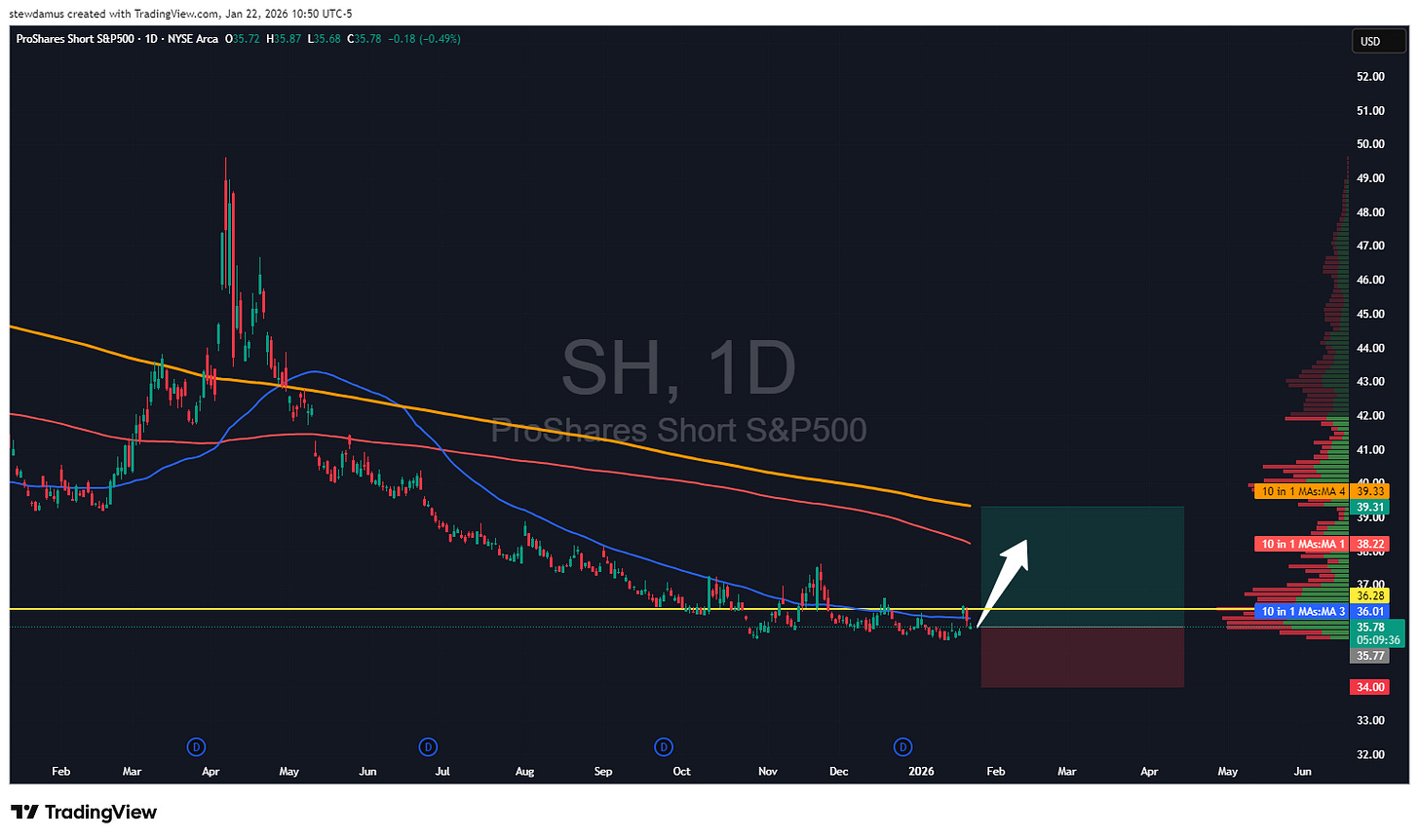 Gonna put my money where my mouth is here. Expecting an imminent pullback in the stock market. I’ll use the ProShares Short ETF for this trade. We’ll do a 1:2 rrr for this trade. Shooting for that orange 350-day SMA (currently at around $39) and I’ll set my SL at $34.