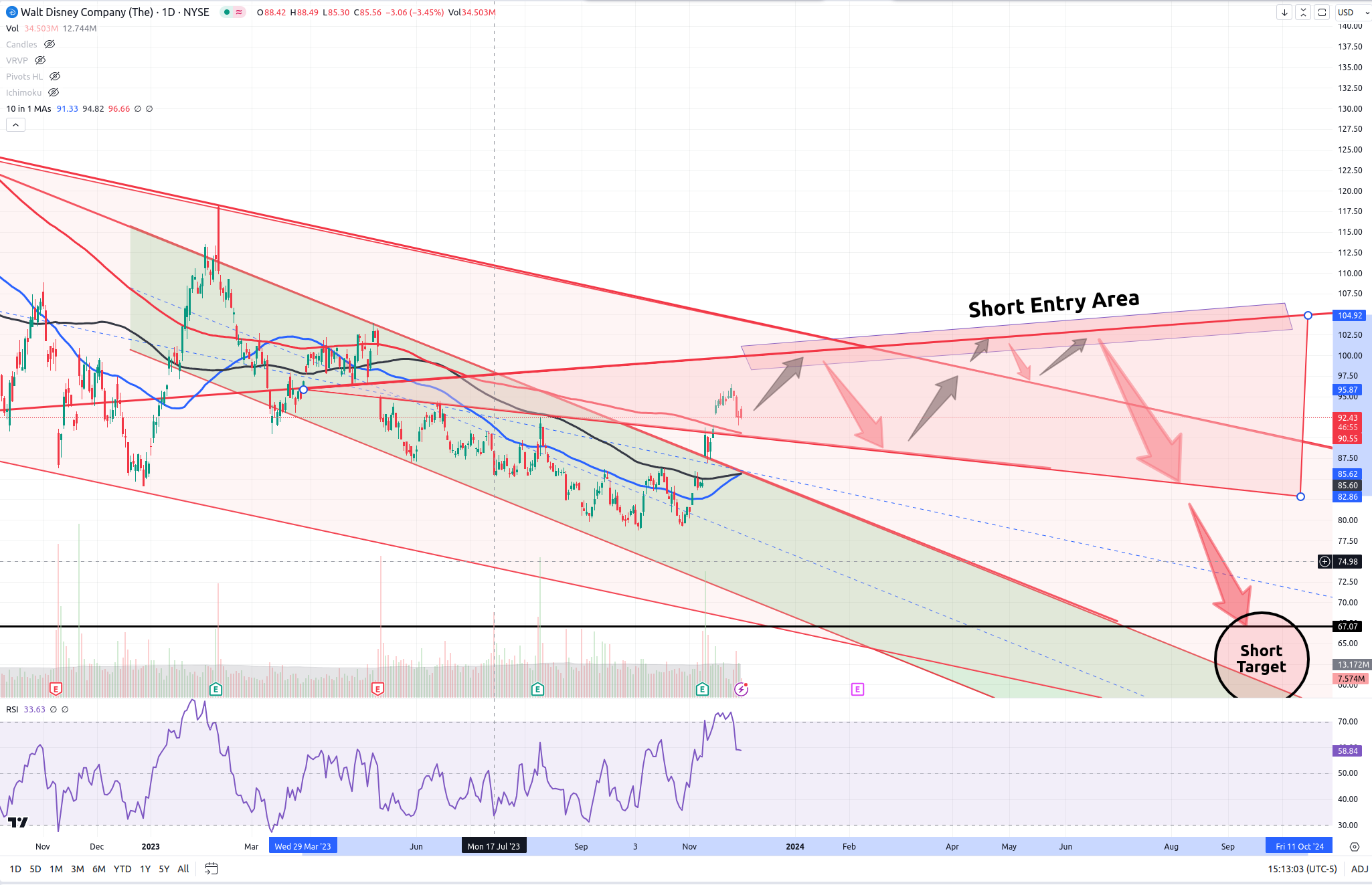 Now, zooming in to the shorter-term perspective, you will note that we have been moving up most recently. Yes, the market can be irrational as I have observed and alluded to in my post numerous times before. But here we are. Actually, Disney is not looking bad for a short-term long trade to around the $100-$104 price target. But after that? I would want to short the sh** out of this thing. Longer term target down would be anywhere from $67-$60 somewhere around mid-2024.