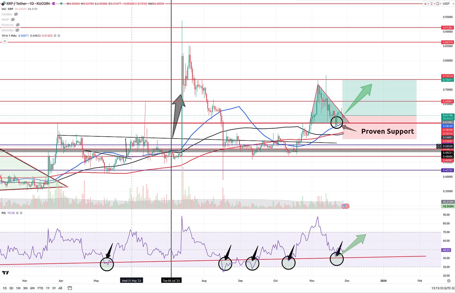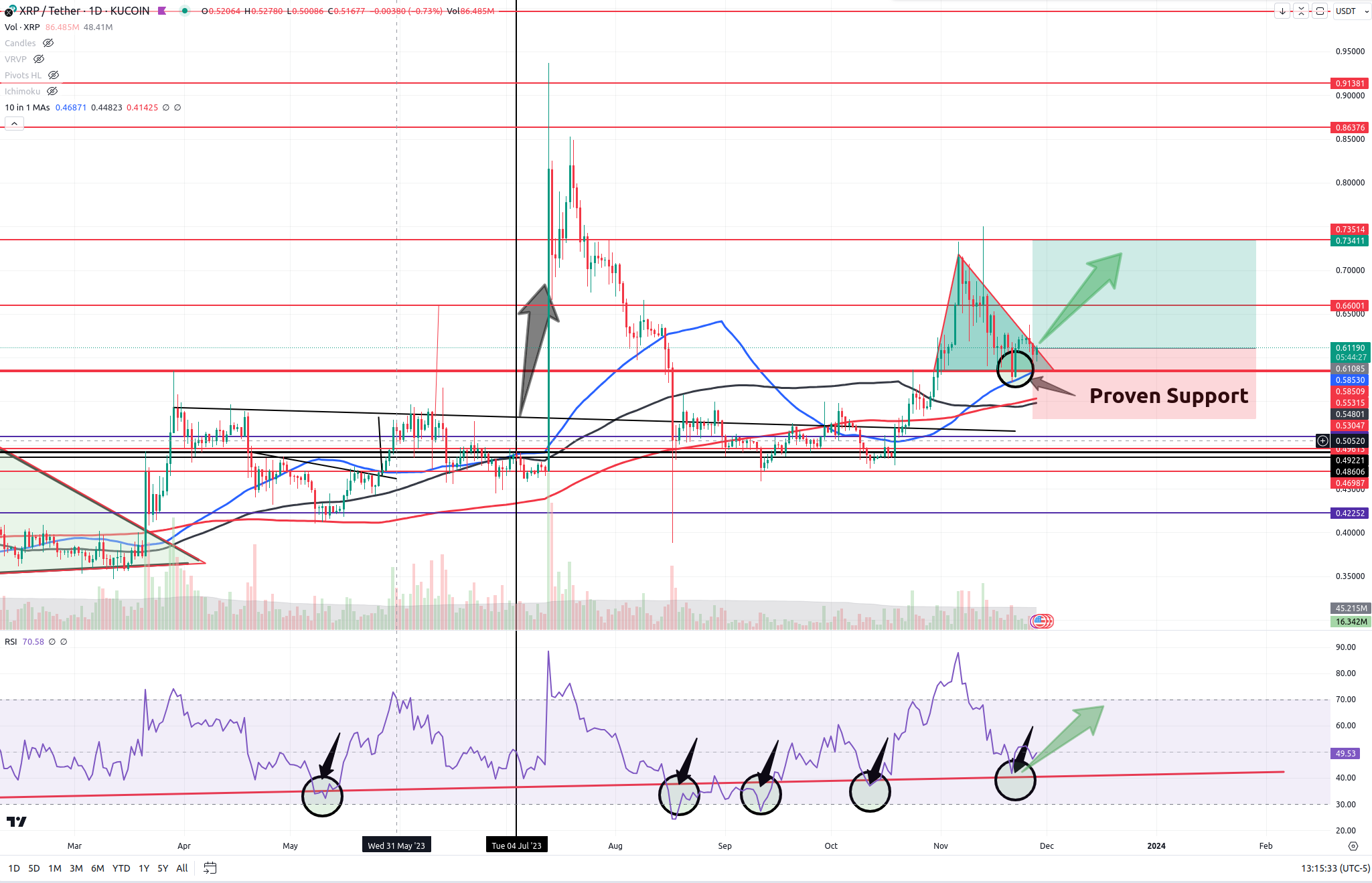 I really like XRP at this level. The 58 cent level proved it is legit support and XRP now looks to have formed a bull flag which it is at this moment attempting to break out of. All moving averages are on the underside of us assisting the 58 cent level in supporting price. Additionally, we have touched that RED line (see RSI) yet again and everytime we do so a decent pump has followed. I'm long to 73 cents with my SL at 53 and a RRR of 1.5. My stops are rather loose. Others may tighten that up to increase the RRR pending risk tolerance.