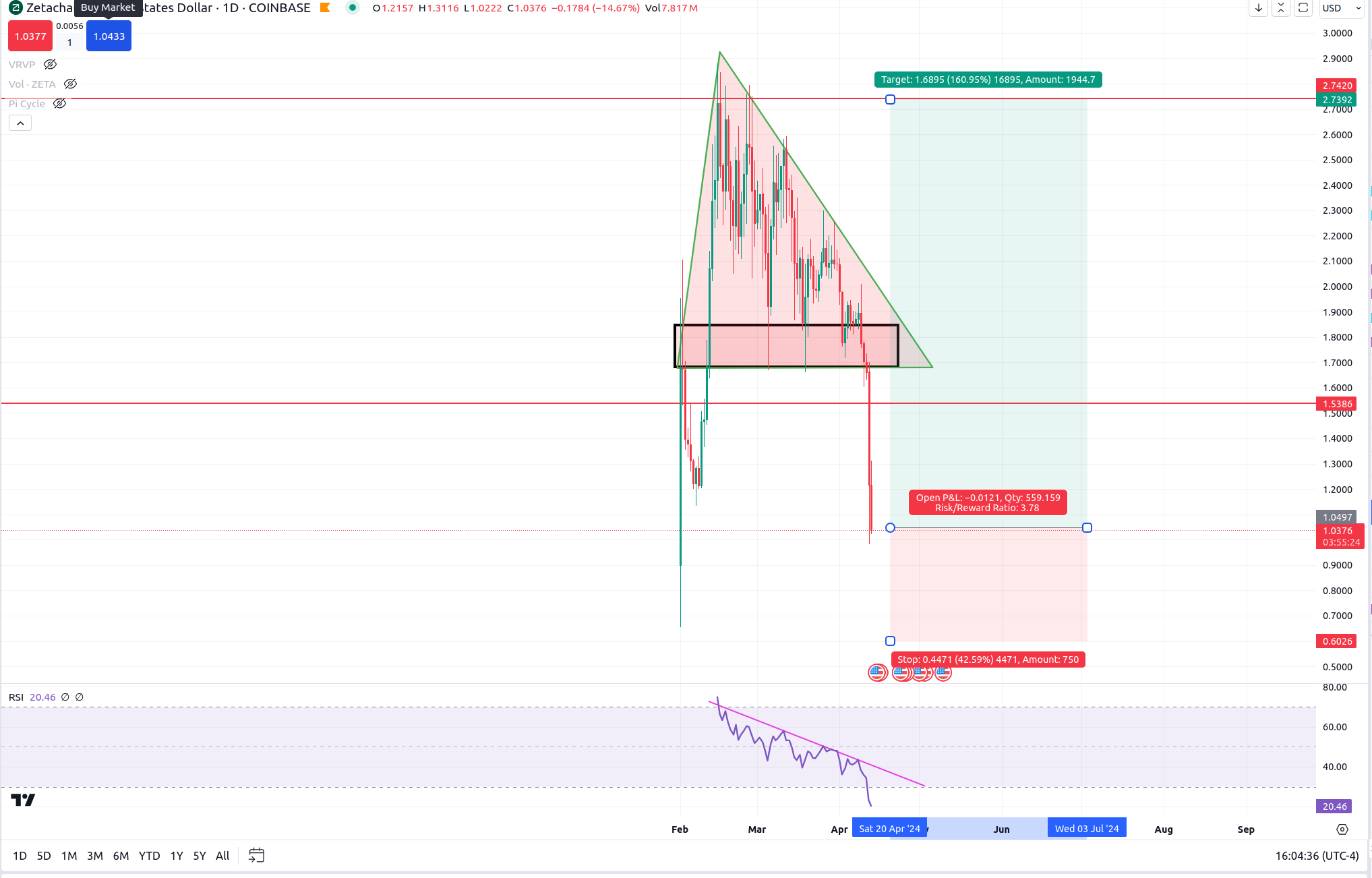 Nobody can call the bottom. Best guess is when we near it. My guess is that with ZETA we are close. I’m longing this thing again (second try) at 1.037. Target is 2.73. SL is .60 for a RRR of almost 4.