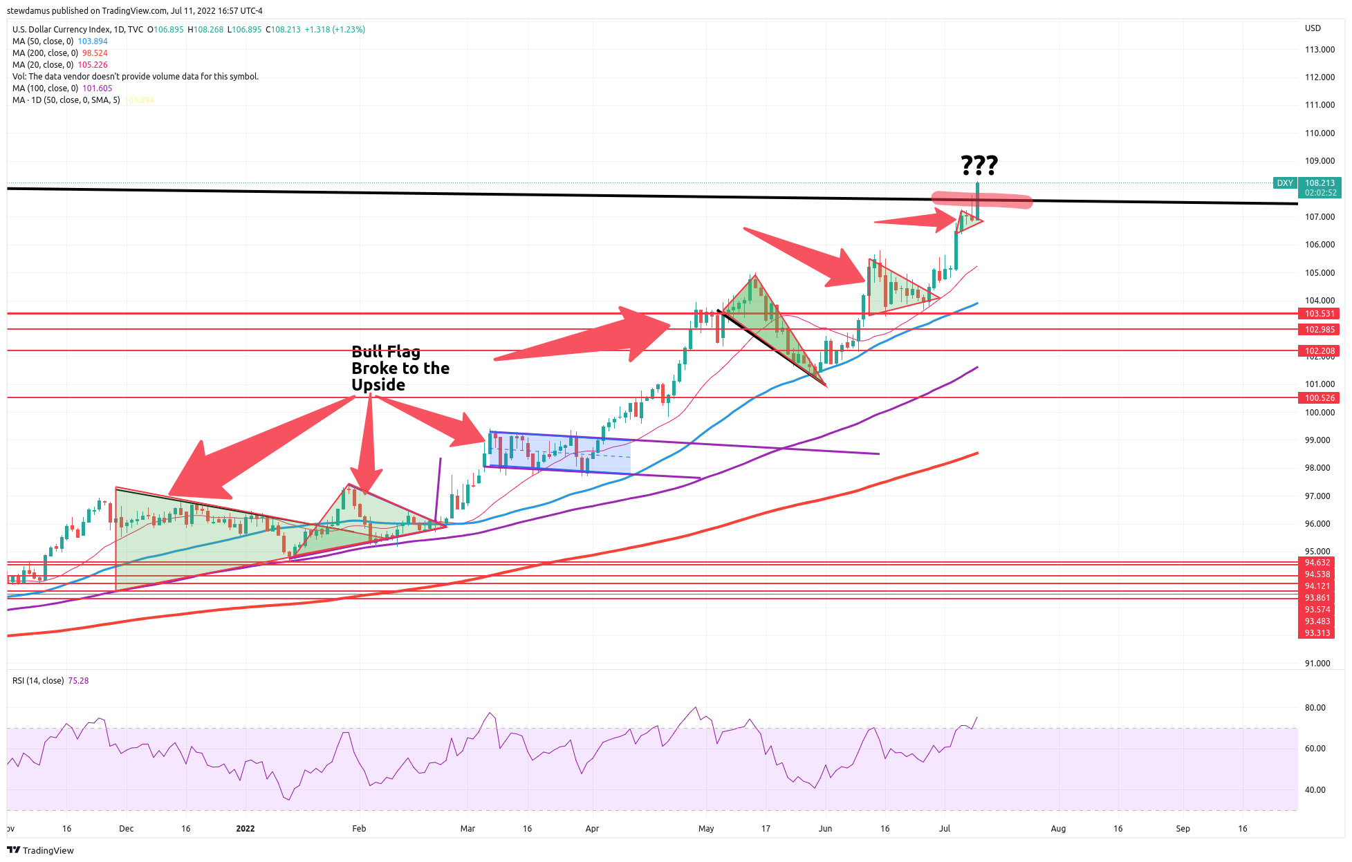 First, the dollar has been showing amazing strength over the past several months. Bull flag after bull flag and they have all carried out as expected. Now, currently, it is up against what I would consider significant resistance. We should find out this week whether or not this resistance can be defeated or whether the dollar will fail its continued move up and come back down for a bit of a rest.