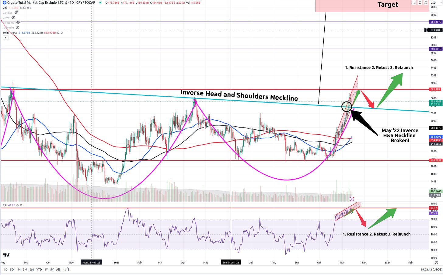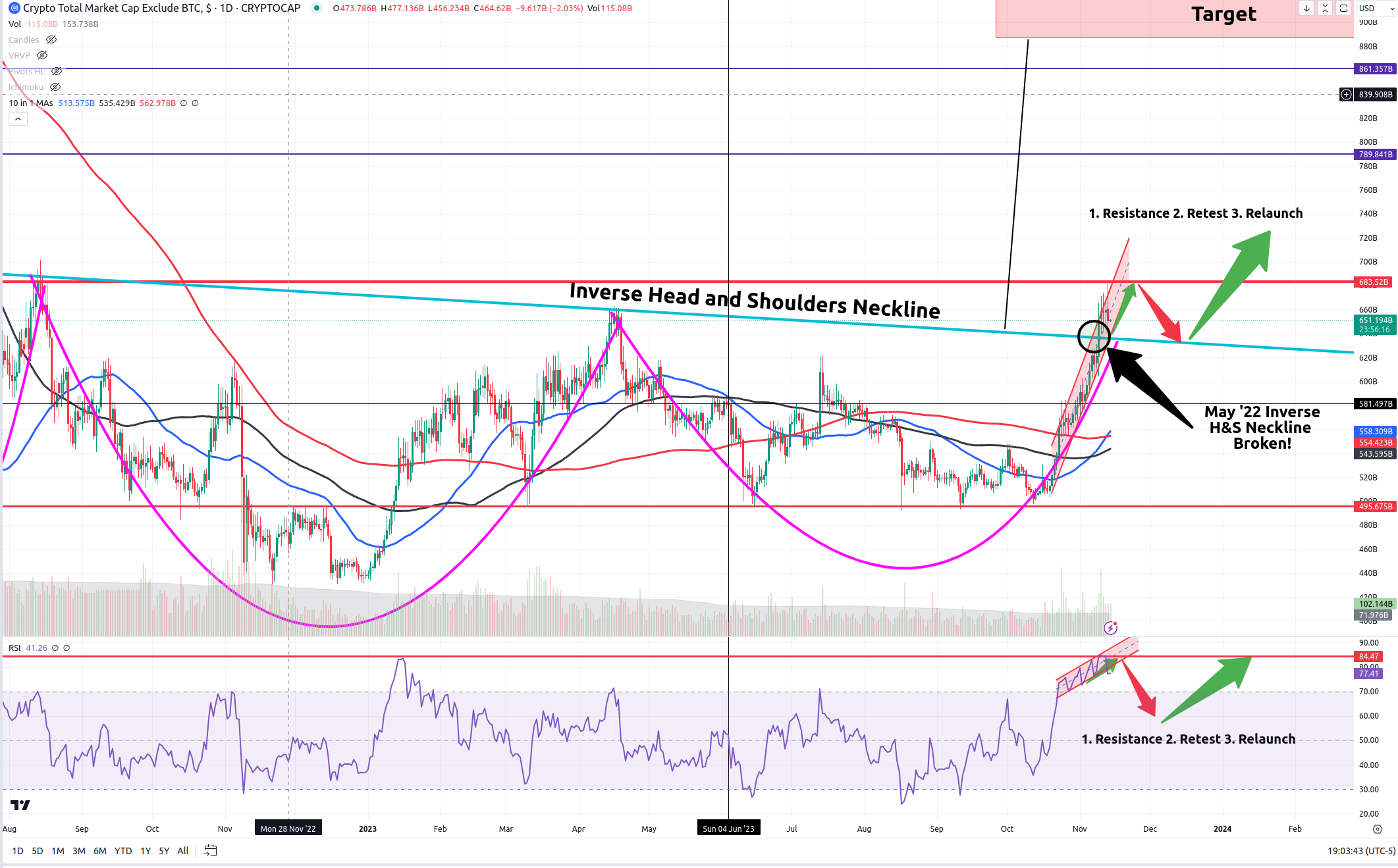 For the first time in a year and a half, alts have broken above major resistance. This resistance happens to be the neckline for our long-trending inverse head and shoulders. This is hugely bullish!
