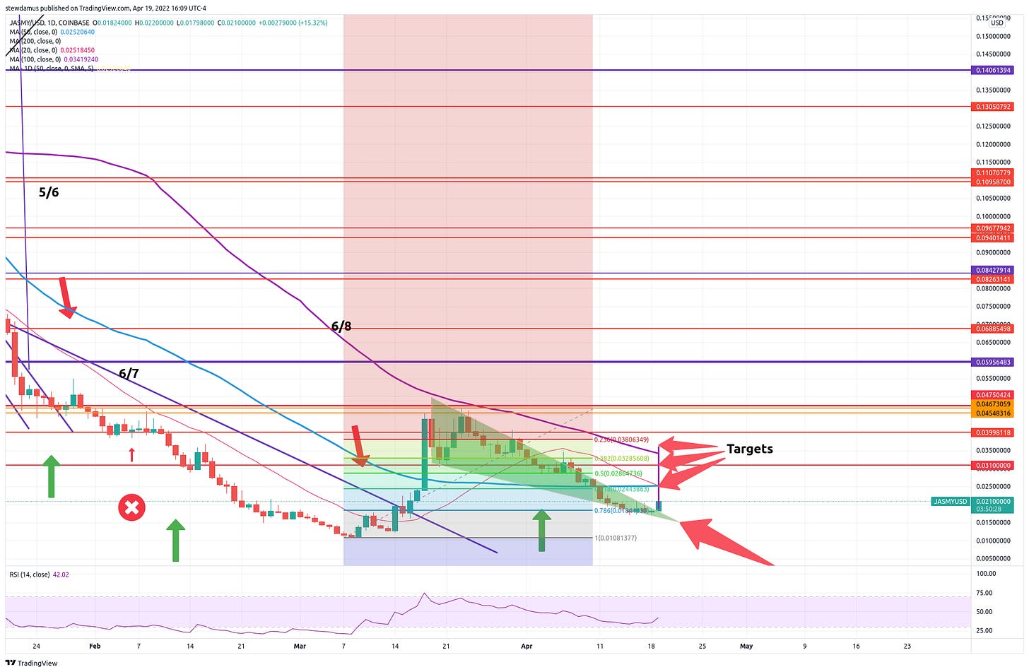 Minutes after I release my video update this morning, Jasmy pumped. Currently, it is up over 17%. So now, we need to start thinking about where we should sell. I see several good fairly conservative targets in site: