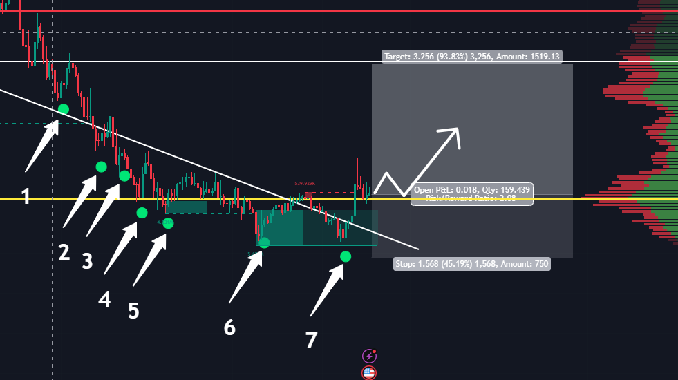 Additionally, you can see that our price has broken above a strong descending resistance trend line (white) and is currently above the VRVP point of control (yellow). This is where I have entered our trade. I expect some accumulation for the next few days or weeks before further upward movement continues.
