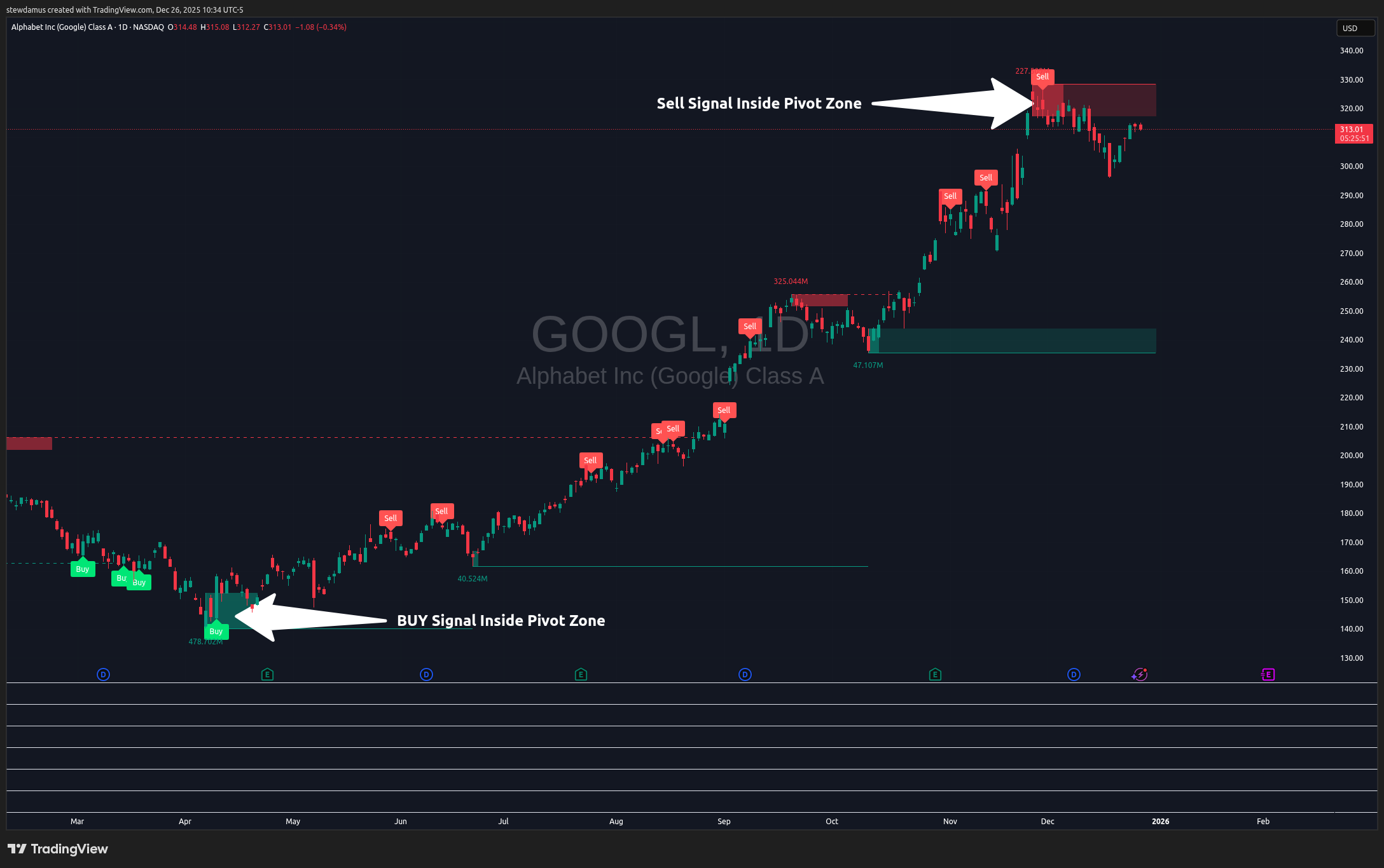 So here, you would have bought GOOGL when the “Buy” signal was given in the green pivot zone at a price of 143-159, and you might have sold when a “Sell” signal was given in the red pivot zone at a price of 316-326 for over 100 percent profit!