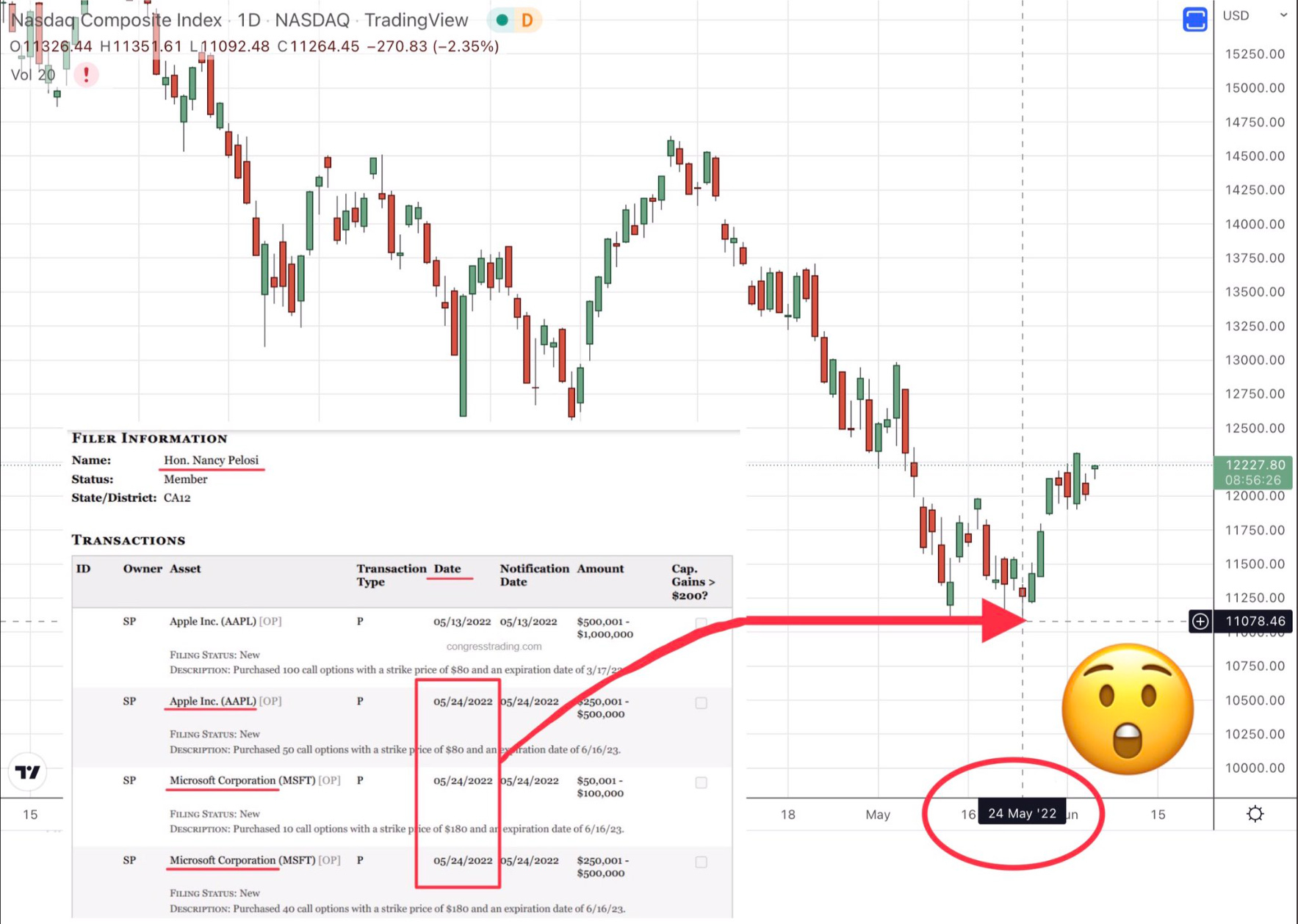 I ran across this tweet this morning which I thought I’d share with you all as a lead indicator of what our market future might be over the course of the next several weeks. Keep in mind, that this may only be weeks to months ahead. The following is a chart of when Nancy Pelosi bought AAPL and MSFT. Notice: The very bottom. The wick down on the lowest candle this year! She literally nailed the exact bottom thus far. She is 82 years old and yet trades options better than a Citadel algo running on a dedicated $300 million mainframe. Could this indicate our market bottom for a little while? It would be foolish for us to dismiss this possibility: