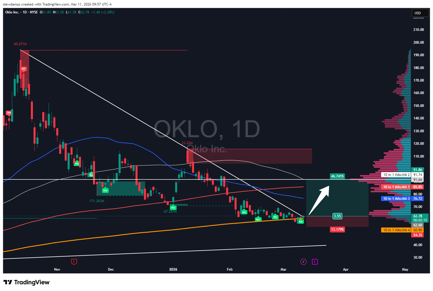 Risky trade here in these volatile times. But I think I have found a trade I am willing to take here. OKLO is currently sitting on its 350-day SMA. This is huge support! I think it may propel it to break that giant wedge to the upside. If so, there will be plenty of profit to be had.
