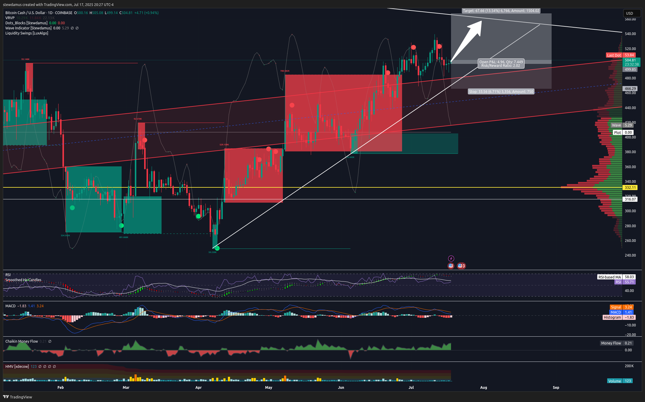 I’m opening a small trade on BCH 0.00%↑ here, quite honestly, because mostly I don’t want to be sitting on cash rn. Alts are popping all over. One of the least heated is BCH, and even though it’s made quite a run since April, I still see plenty of potential here. However, I’ll be shooting for a modest target this time of just 13.5%. And if my SL is hit, the loss will only be half of that.