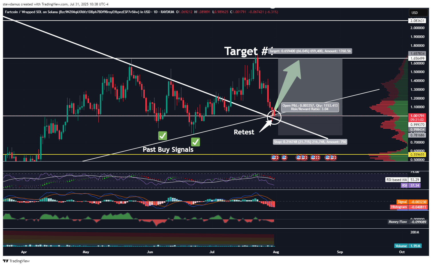 I may be a little early here, but at $1.00, I can't resist. I am picking up a small position in FARTCOIN here. I have three targets above. Each will eventually be hit IMO, but for now, I will only be shooting for TARGET #1. I may sell half at that point and let the rest ride.