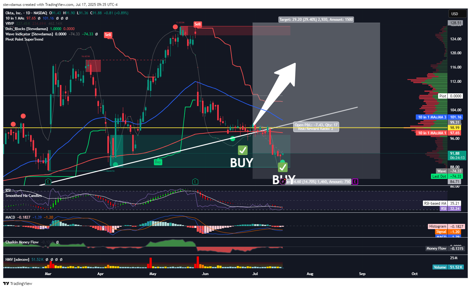 At times, my indicator gives us more than one signal. This usually indicates that the move up will be stronger and more aggressive than previously indicated. Such is the case with our OKTA entry. We’ve got another BUY signal that has been given, and so, I am DCA’ing in. The target and SL will remain the same as our previous entry. All data can be found on the tracker below.