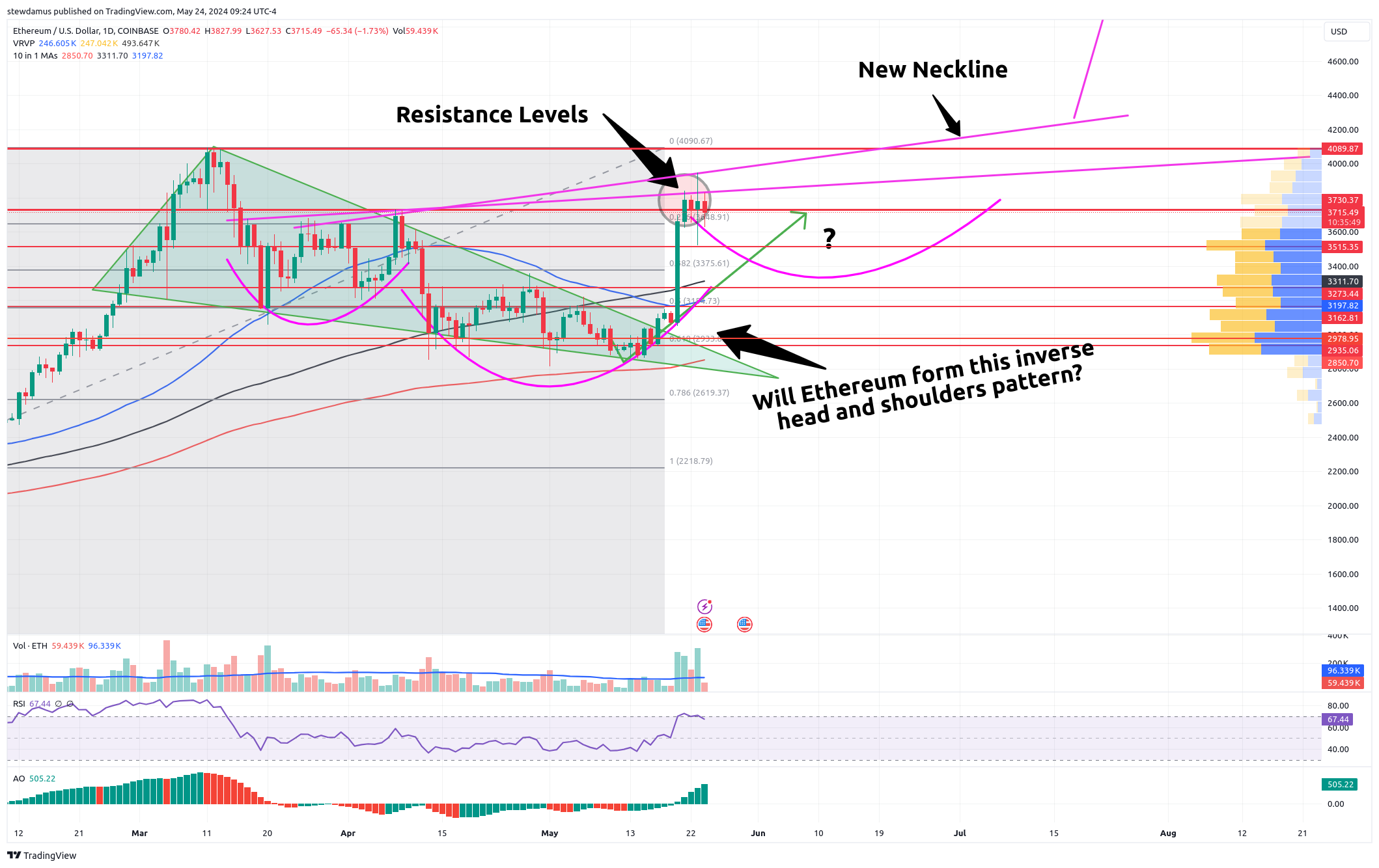 Look at the Ethereum chart above. I have been attempting to keep you all aware of what Ethereum price action might look like should there be either a ‘sell the news’ event or some other negative news item regarding Ethereum (or crypto in general). In my estimation, a small pullback or consolidation/accumulation period here might make sense. It actually becomes bullish as it forms the right shoulder of that inverse head & shoulders pattern that may play out.