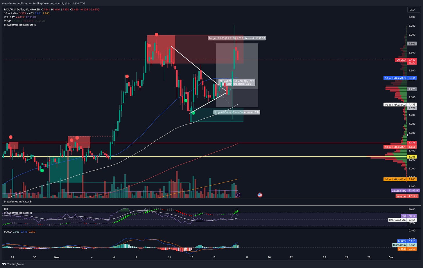 We entered this trade on the 4 hour time frame. Reason? Well, tbh, prices are moving fast. But we are also starting to get toppy. I knew that liquidity block overhead would be significant resistance and so, I set my target right in the middle for a 1:2 rrr and sold half. We’ll let the rest ride here on Raydium. The Solana chain is white hot rn.