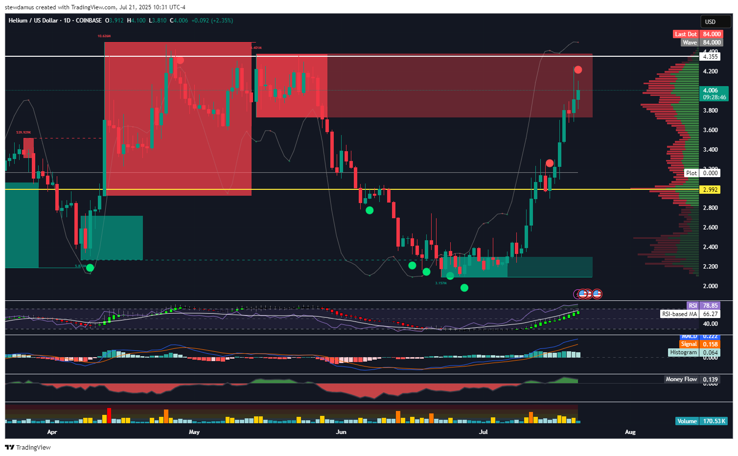 First and foremost, HNT has entered into a large sell-side liquidity block, and my indicator has given me the SELL signal. The VRVP supports massive volume resistance here as well.