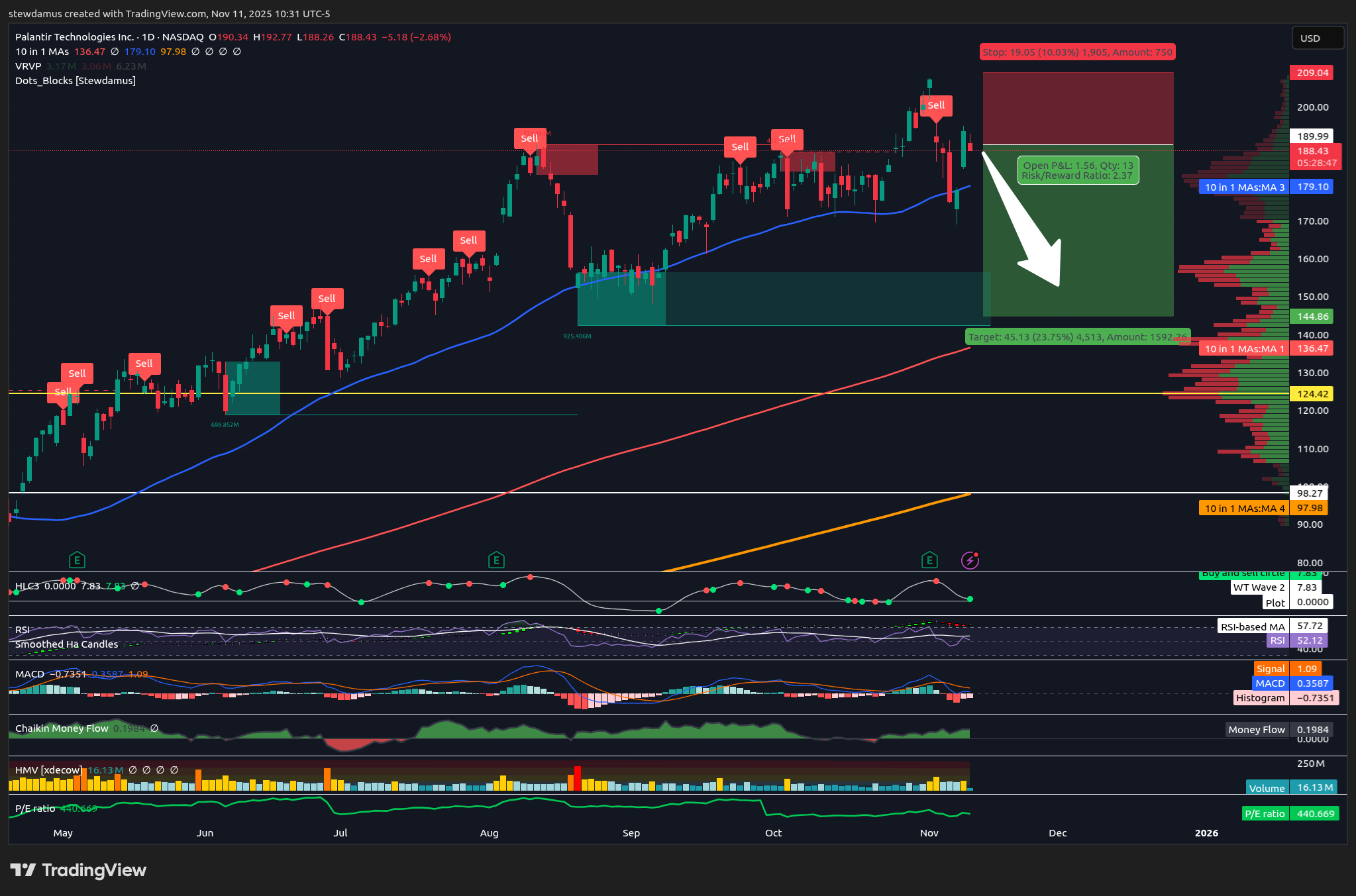 As far as $PLTR goes, my signal gave me a SELL at $195. As I have been in the habit of waiting for confirmation, I did not enter immediately. Yesterday and today, I believe I have been given the chance for a decent entry. I’ve entered short at a price of $190 and will shoot for that 200-day SMA at somewhere around $145 for a 2.37 rrr.