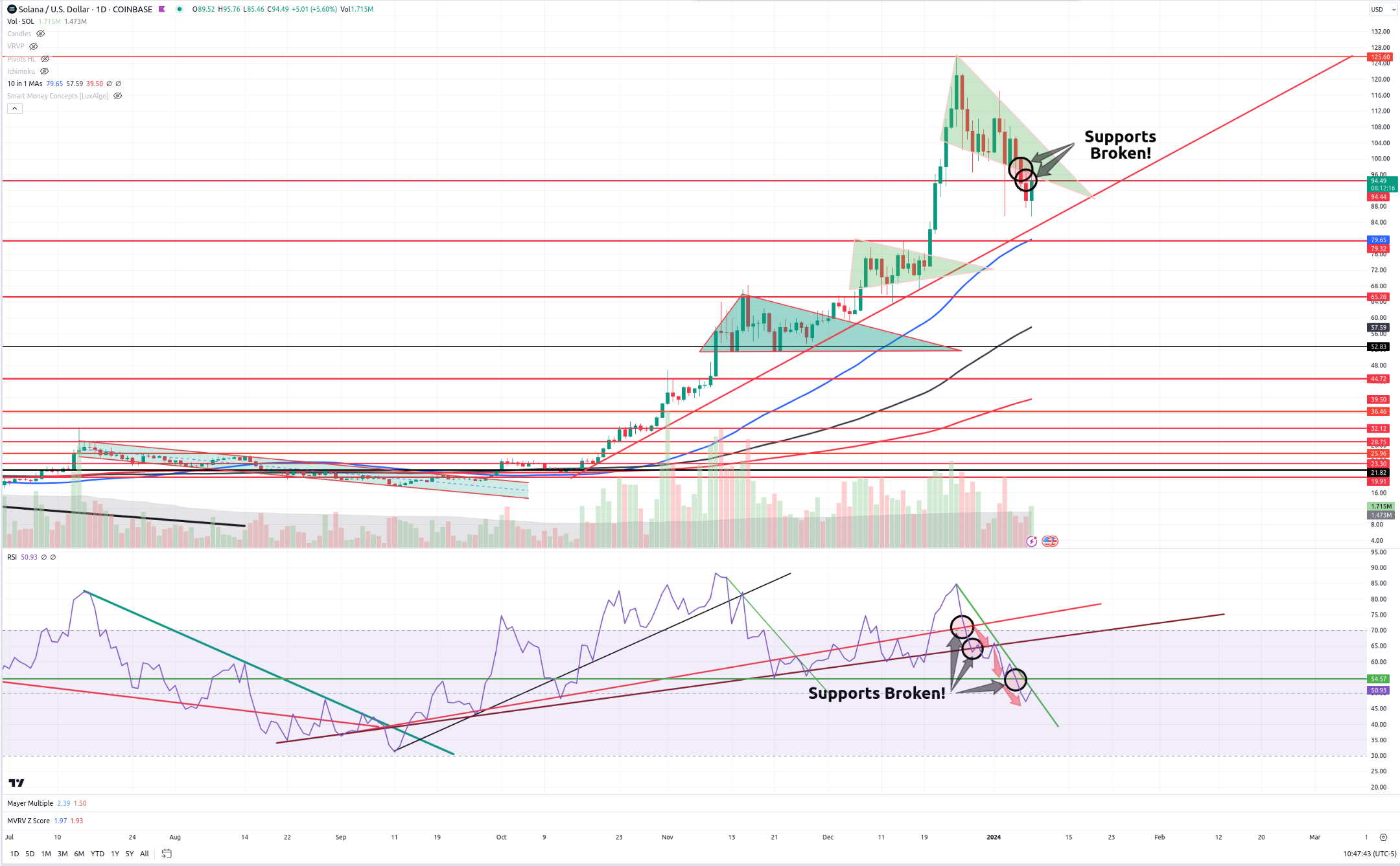 I continue to reiterate the point that our daily RSI is giving hints at what may continue to come for Solana and altcoins. Solana have been one of the strongest alts during this bull run and remains above our red ascending trendline while most others have fallen below. But just as with other altcoin charts, our lead indicator was broken supports on the daily RSI. Three of these big supports have now been broken below. However, on the price chart only two have been broken. Will that red ascending trendline become the third? My bet is "yes" based upon what the RSI chart is telling me, though, it may spike higher first following Bitcoin ETF approval news. If I am right about this pullback, I don't think Solana will find support until around $65 or so.