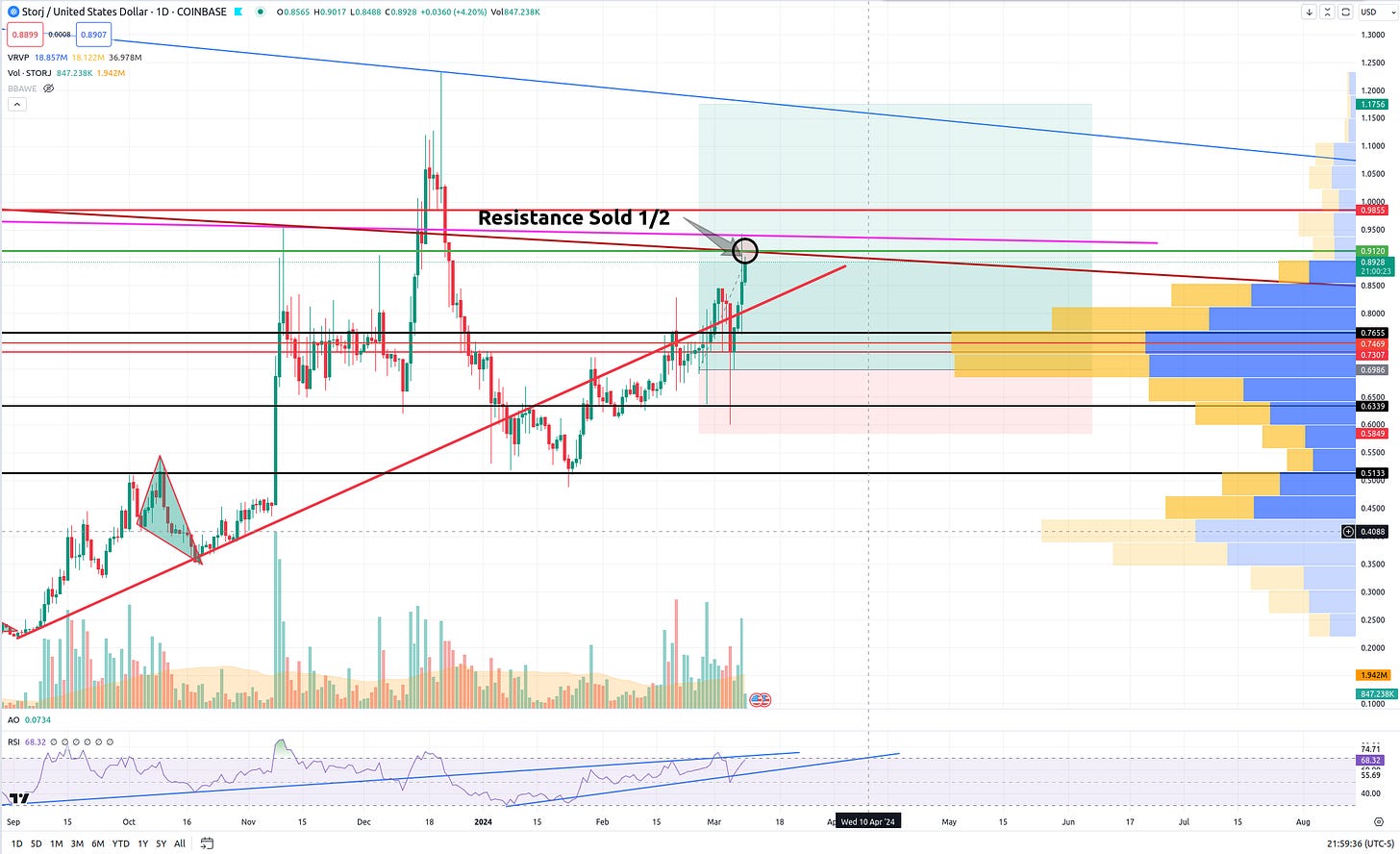 From entry Storj has given us nearly 30% profit. Now, we are coming up into resistance and although, once passed, Storj could give another 30%, I felt a better bet was on Osmo right now since price is currently down. I took half of Storj off for profit at .90 cents, raised my stops to break even, and bought more Osmo.